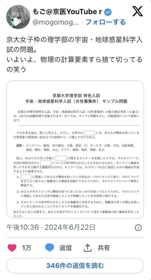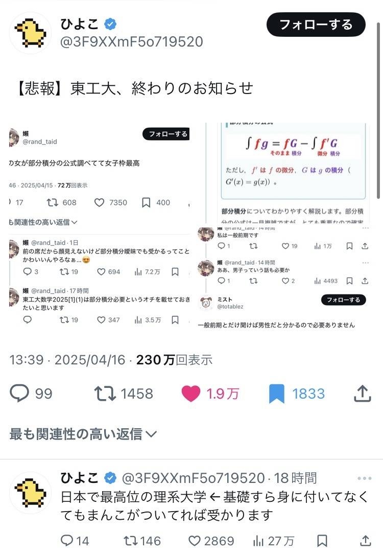 女に生まれたというだけで東工大や京大理学部の学歴が手に入る模様