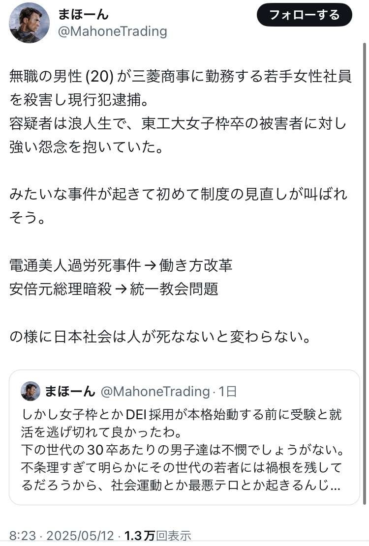【悲報😢】識者「女、子、枠のせいで、今後の日本では女を狙うマ●コ・ヘイト・ジョーカーが現れるだろう」
