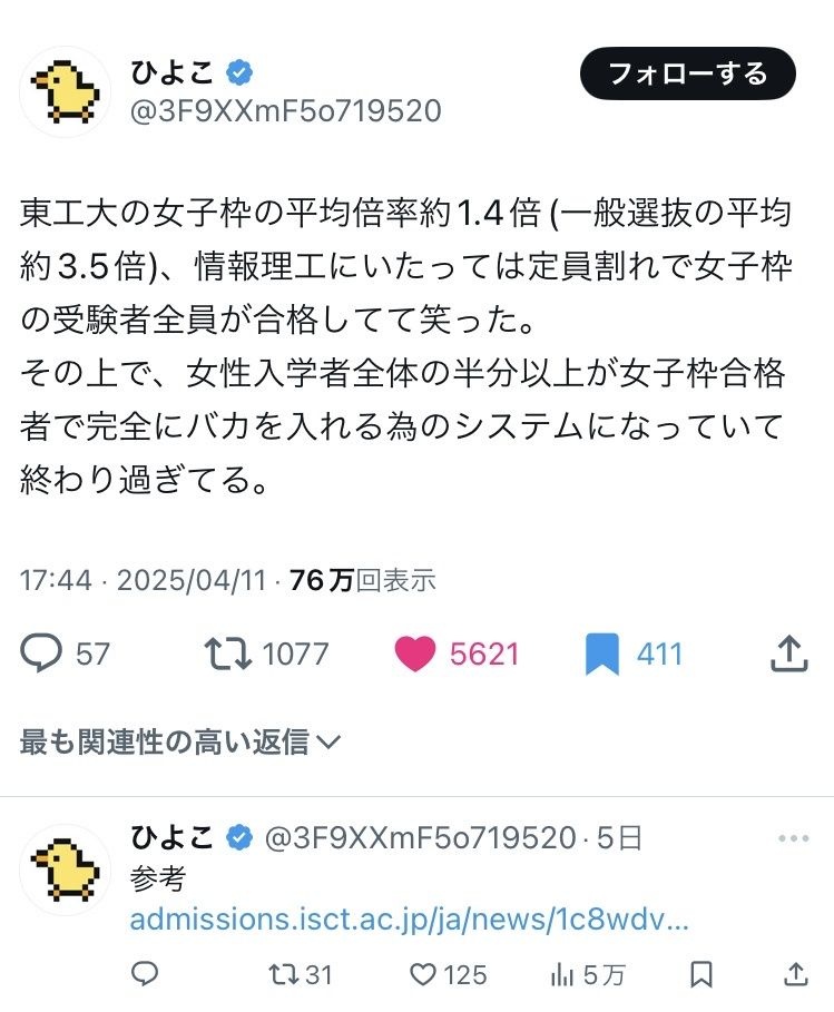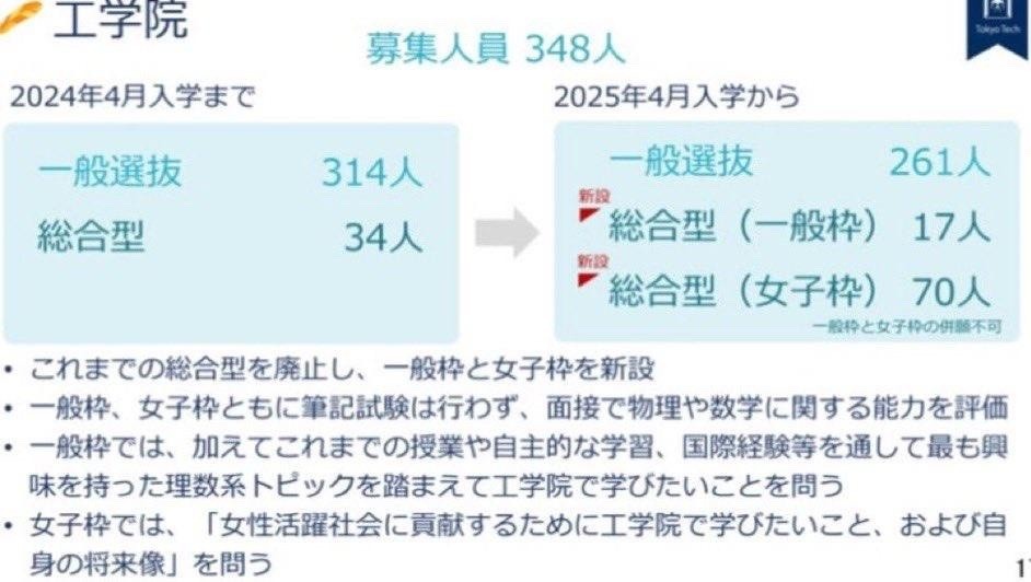 東工大の女子枠の平均倍率約1.4倍(一般選抜の平均約3.5倍)、情報理工にいたっては定員割れで女子枠の受験者全員が合格してて笑った。