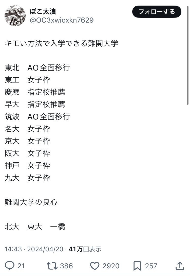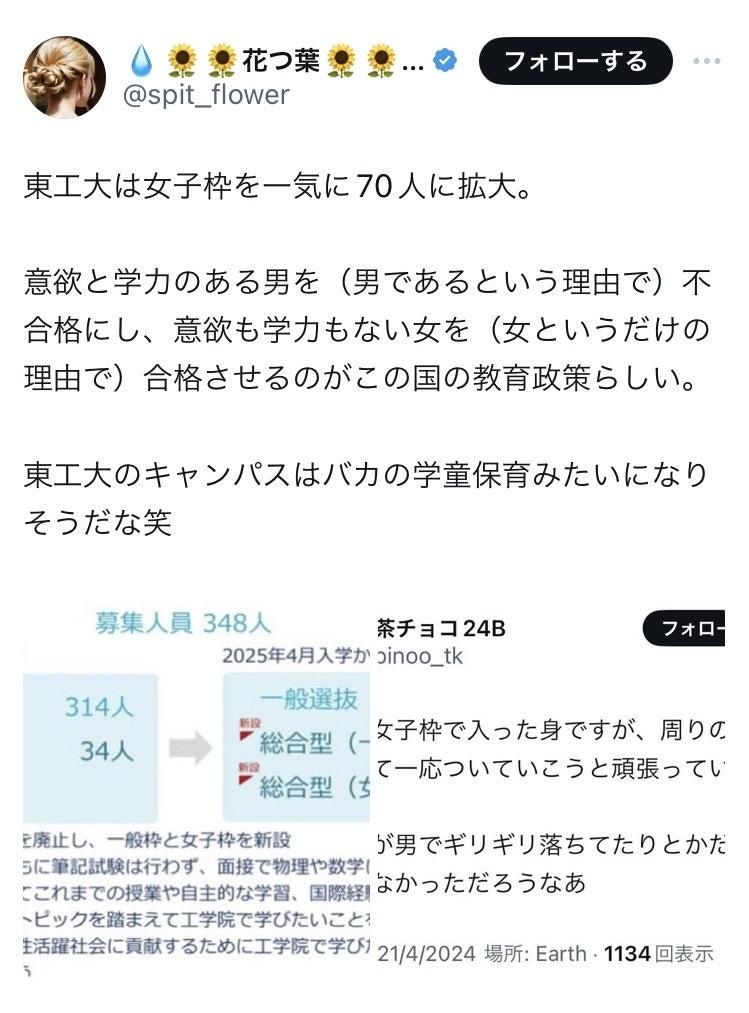 その上で、女性入学者全体の半分以上が女子枠合格者で完全にバカを入れる為のシステムになっていて終わり過ぎてる。