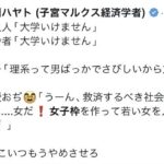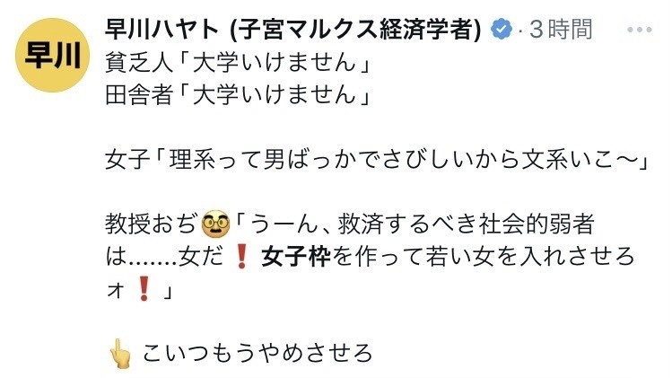 教授おぢ🥸「うーん、救済するべき社会的弱者は…….女だ❗女子枠を作って若い女を入れさせろォ❗」
