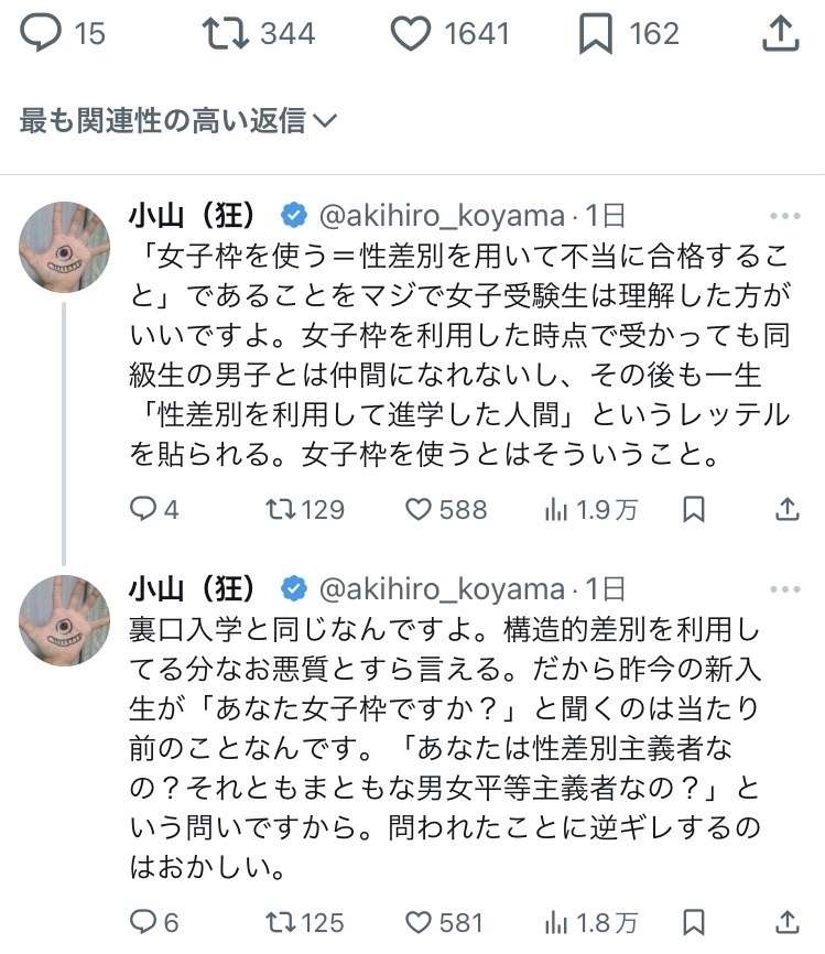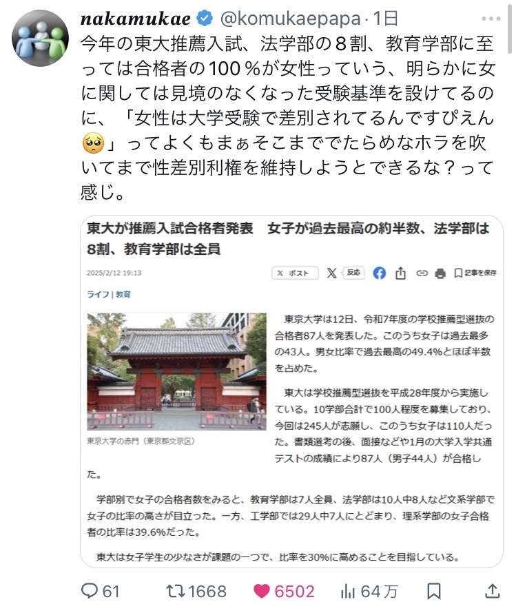 とうとう東大入試もま●こ優遇に舵を切り始めた模様