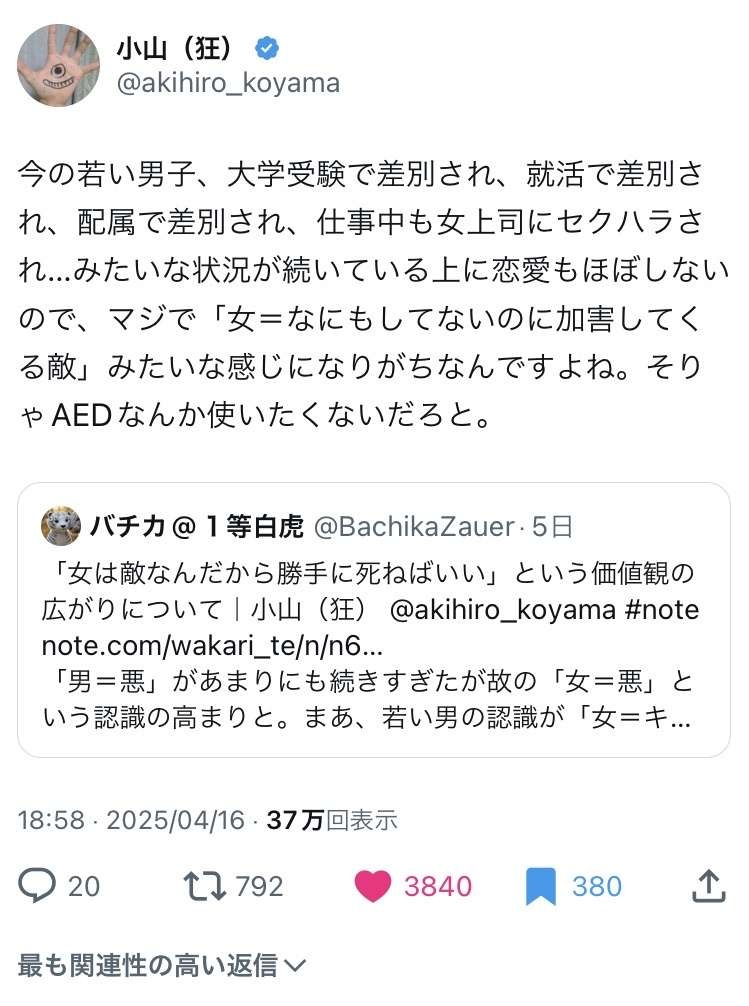 有識者「現代の男性は2級市民。女性嫌悪が芽生えるのに非モテとか必要ない」