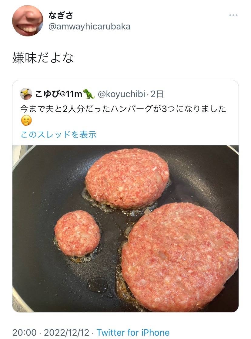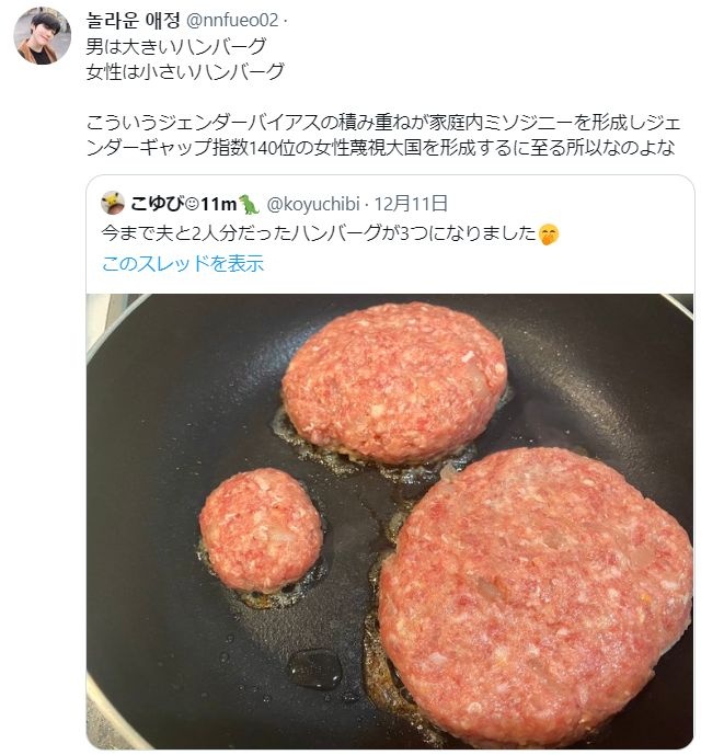 大きいハンバーグは旦那用とは一言も言ってないのに勝手にジェンダーバイアスにかかってるの馬鹿みたいじゃないですか