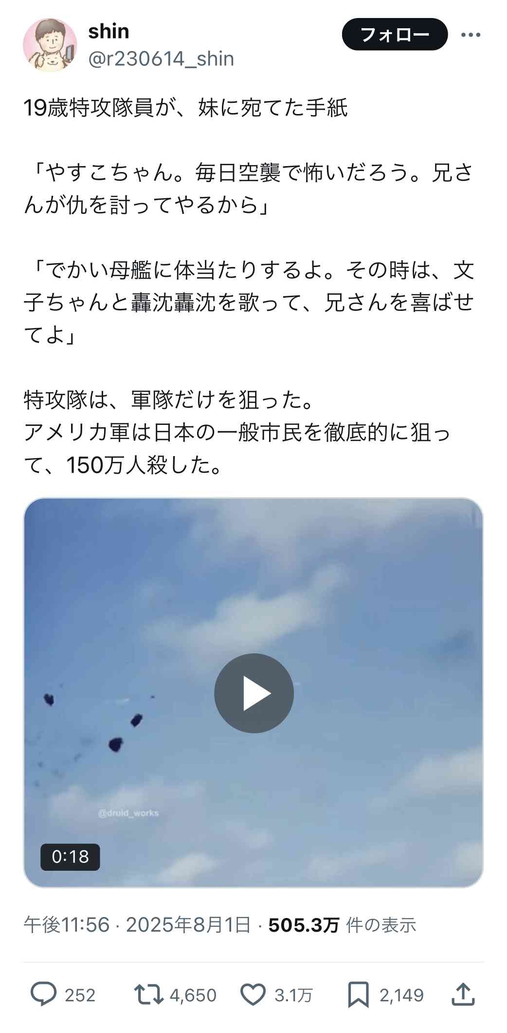 X民「特攻隊は軍隊だけを狙った、アメリカ軍は日本の一般市民を150万人殺した」←3.1万いいねw w w w w