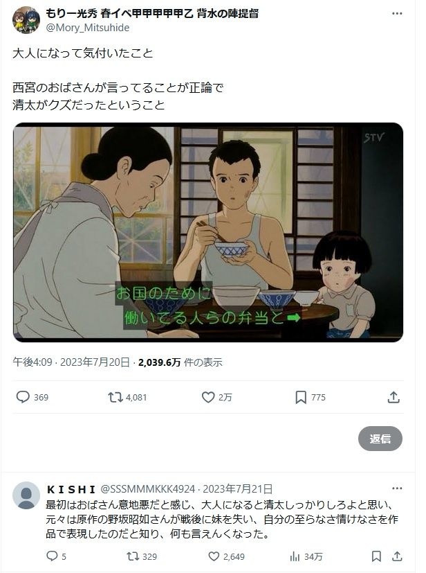 日本人「火垂るの墓は西宮のおばさんが言ってることが正しい😤!!!清太はわがまま😡!!!」