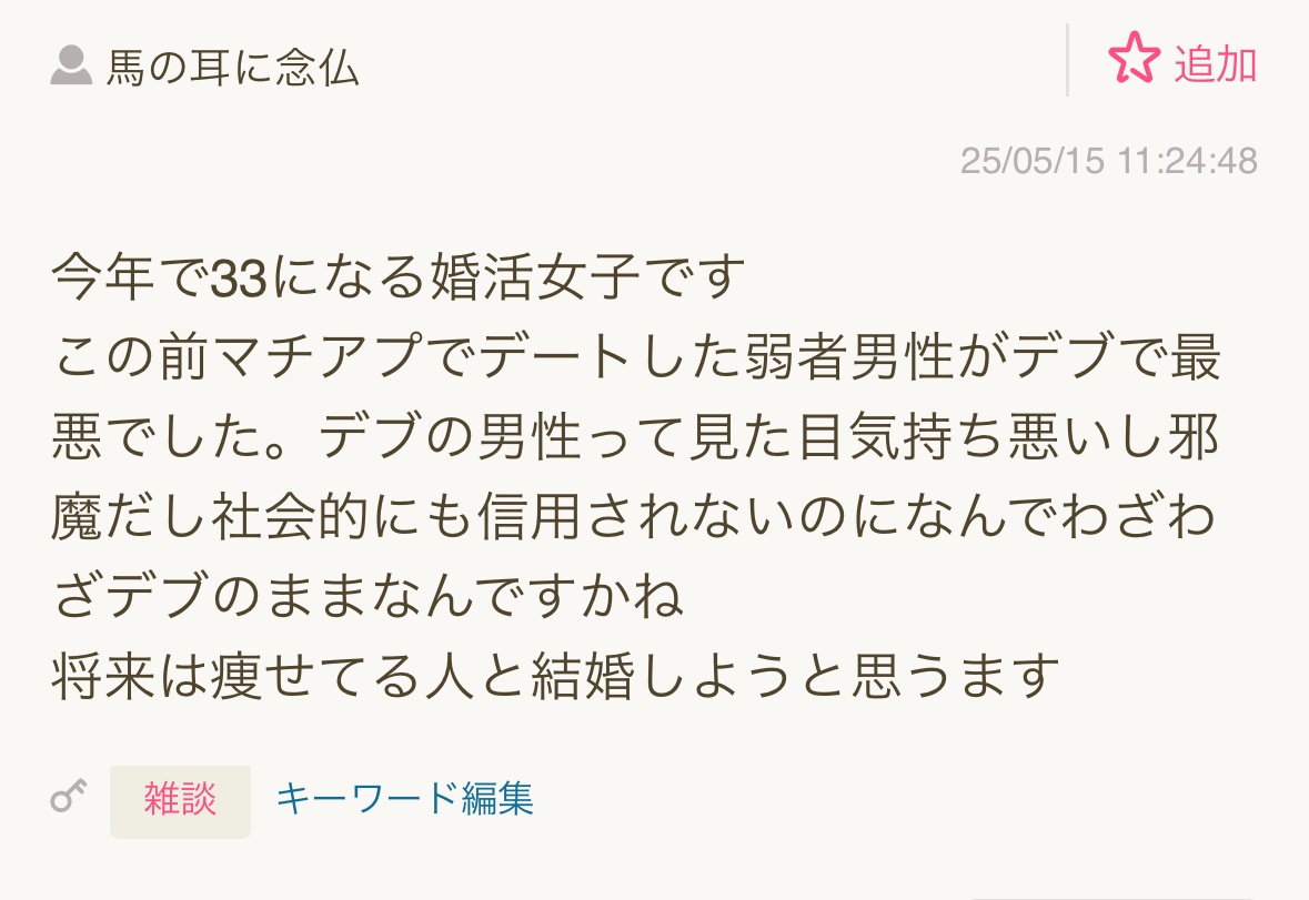 この前マチアプでデートした弱者男性がデブで最悪でした。デブの男性って見た目気持ち悪いし邪魔だし社会的にも信用されないのになんでわざわざデブのままなんですかね