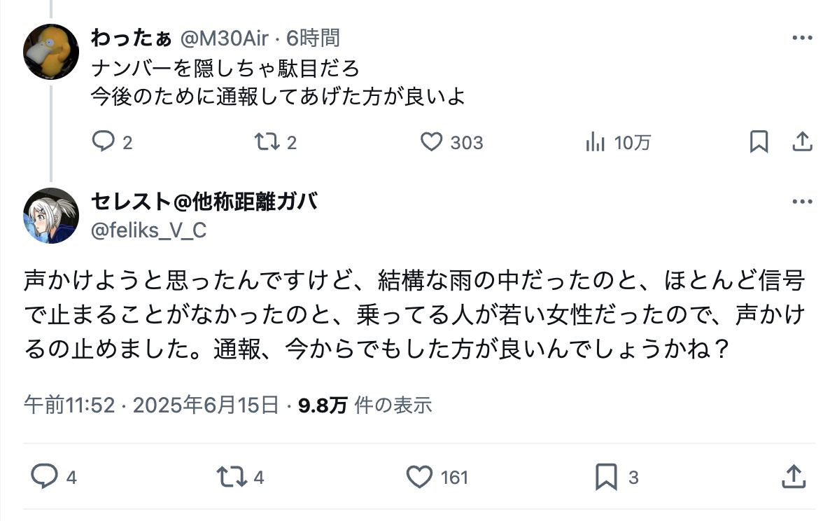 バイクのナンバー折り曲げて見えなくしとるやつとか見かけるやろ🥺☔