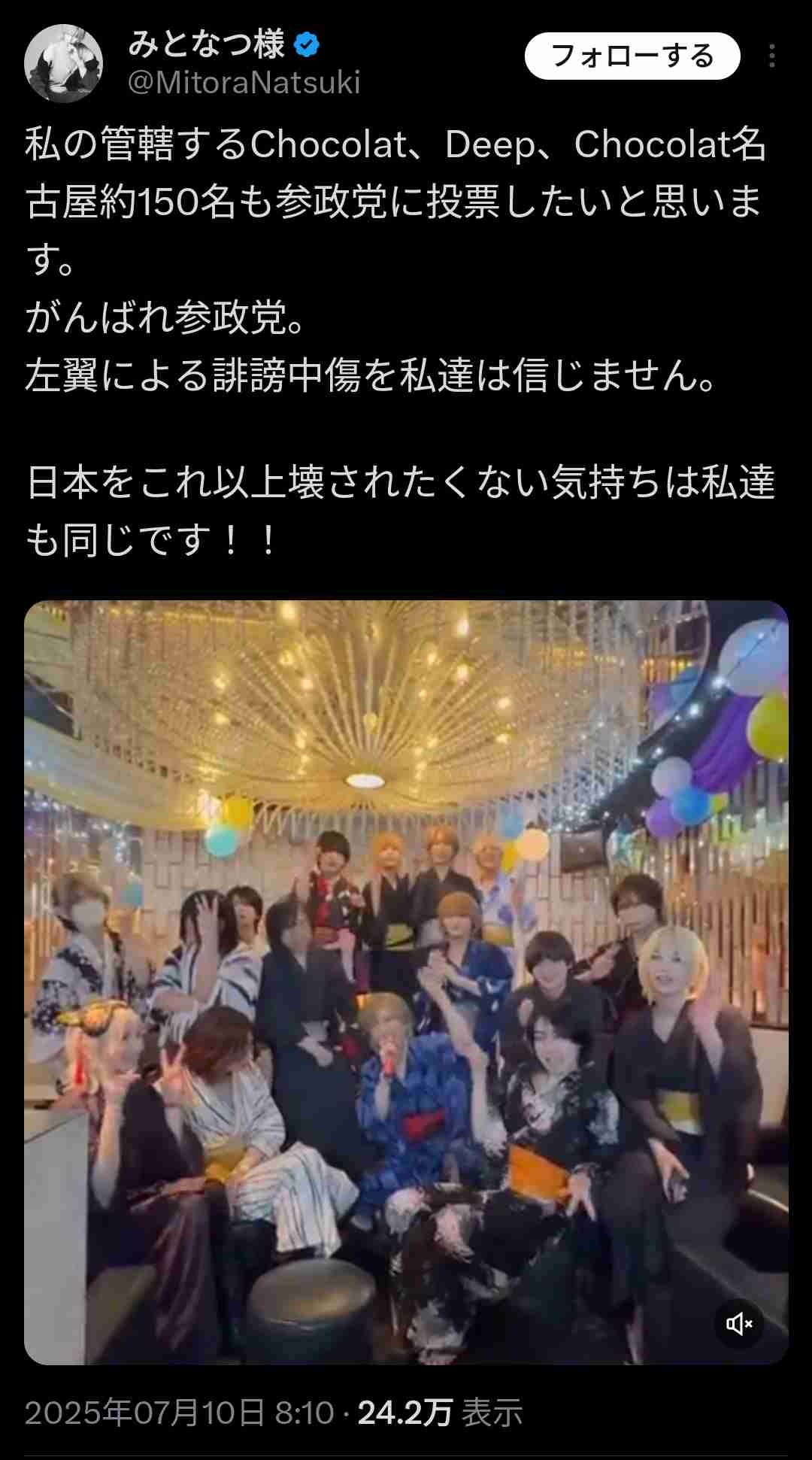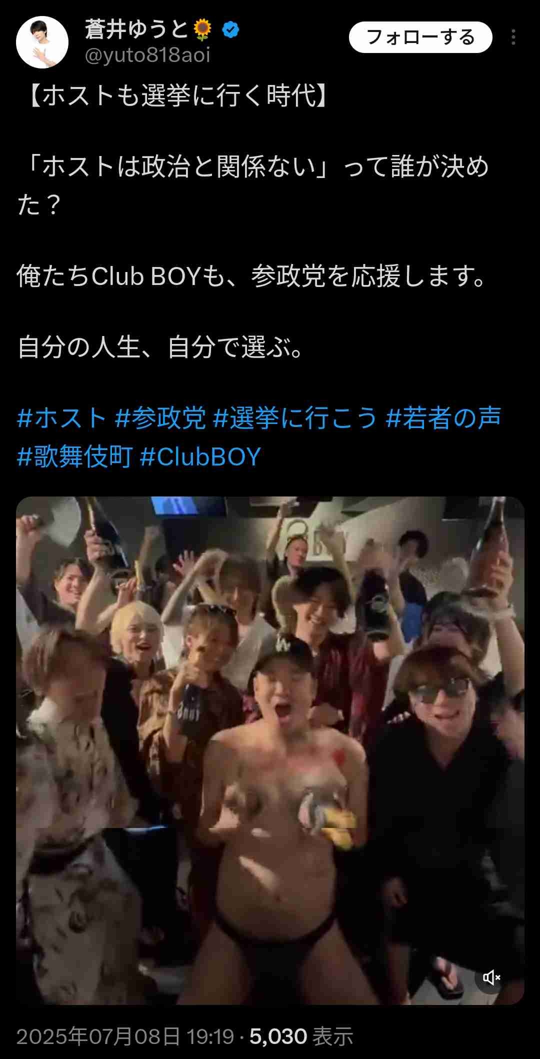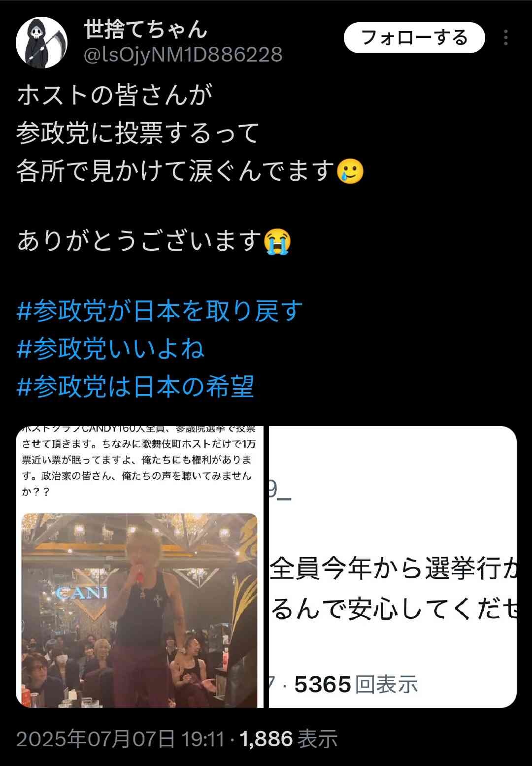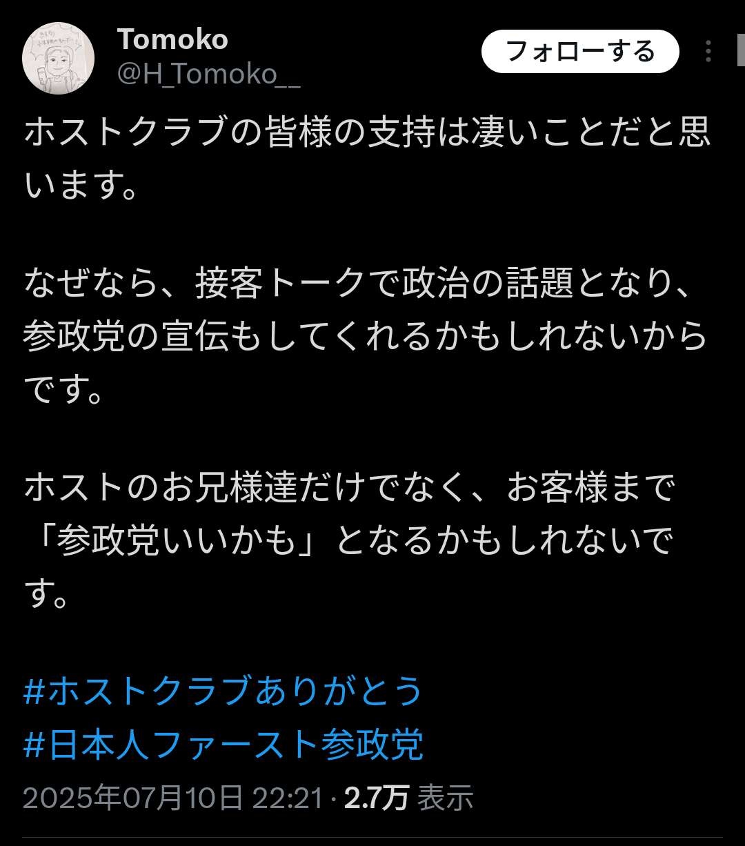 本当にそうだったらホストは選挙に有用な存在だから他の党もきっと放っておかないね - 22 名前:ここからは表現の自由でイカせていただきます 投稿日時:2025/07/11(金) 08:48:07.50 ID:efWAtFgH0