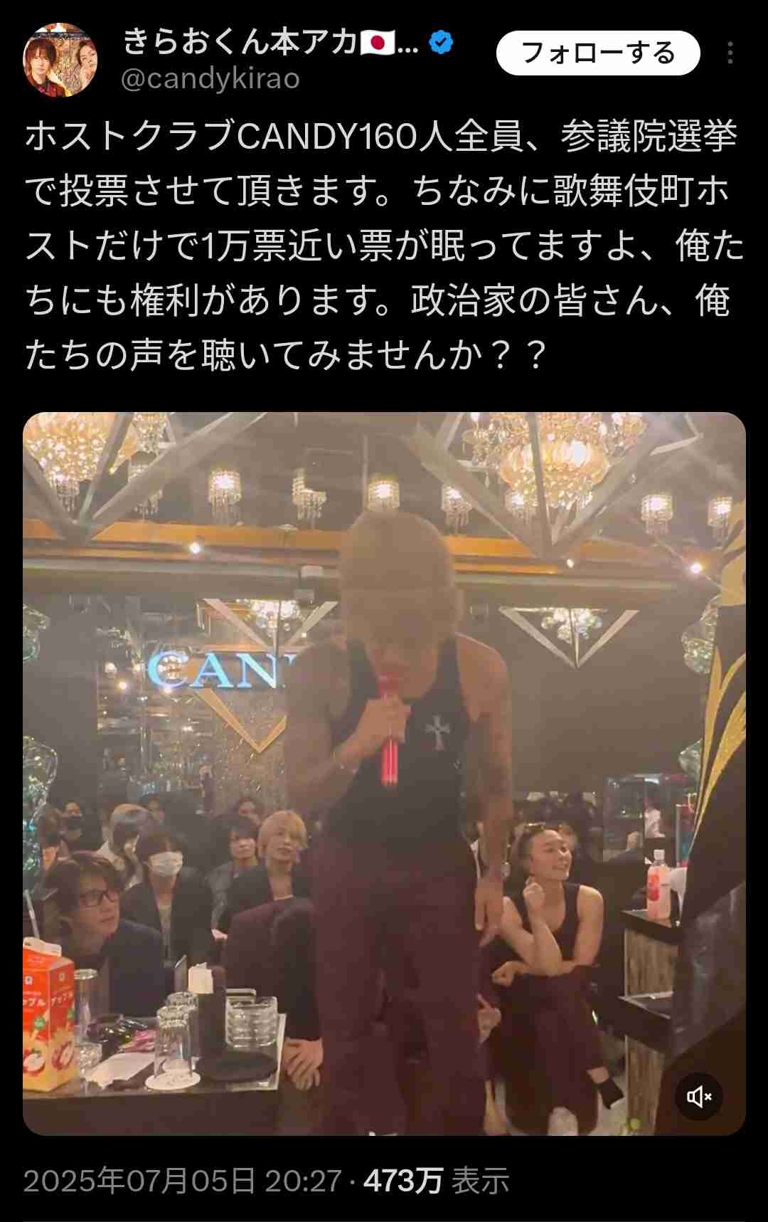 ホストの人達は投票日に二日酔いで行かなくても 客は推しのホストに勧められたら気に入られる為に忠実に投票行動を起こしそうではある - 32 名前:ここからは表現の自由でイカせていただきます 投稿日時:2025/07/11(金) 09:00:17.40 ID:hTMd51QS0