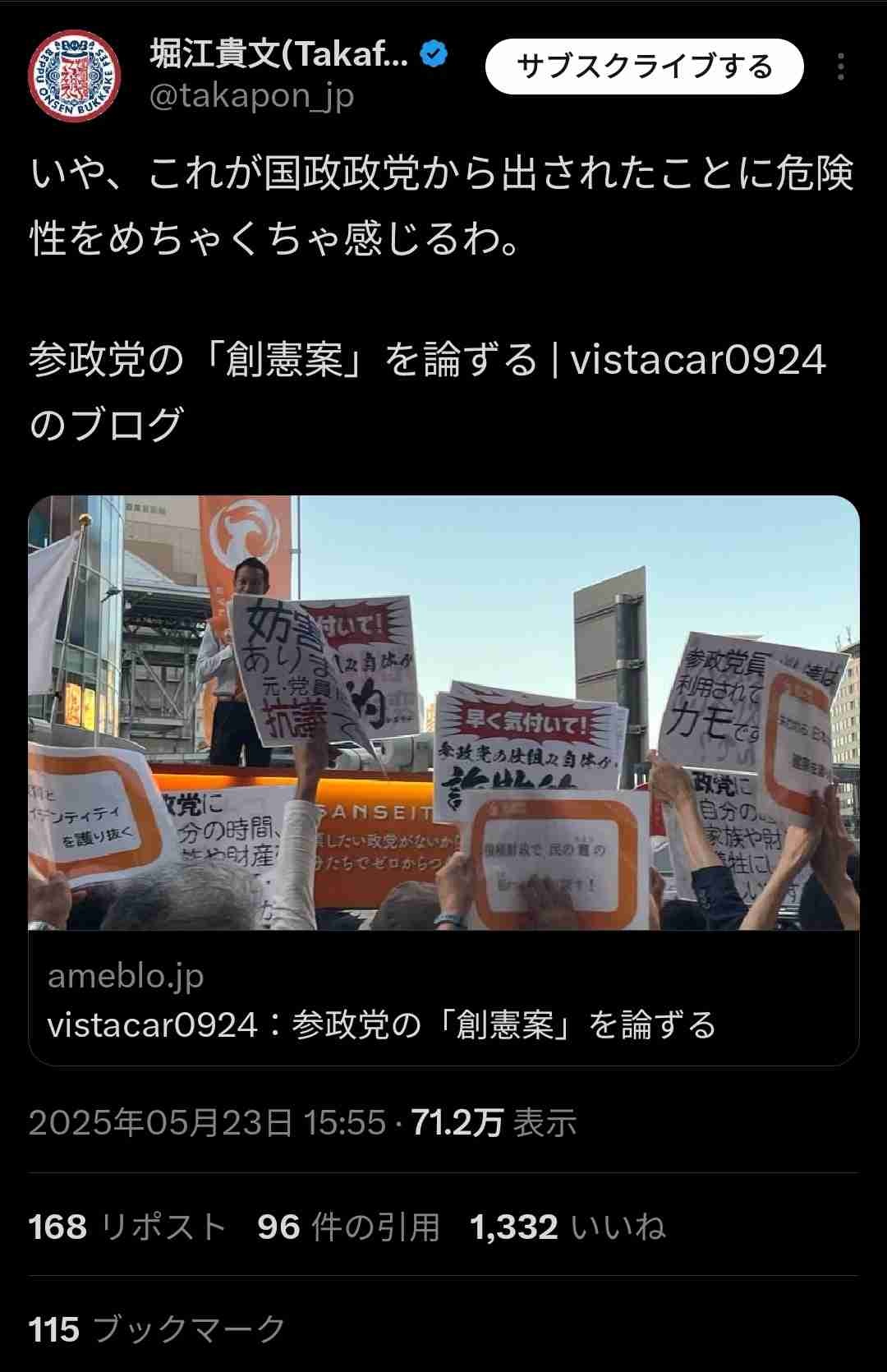 ホリエモン「参政党の憲法草案は本当に危険性を感じる、マジでヤバイ」