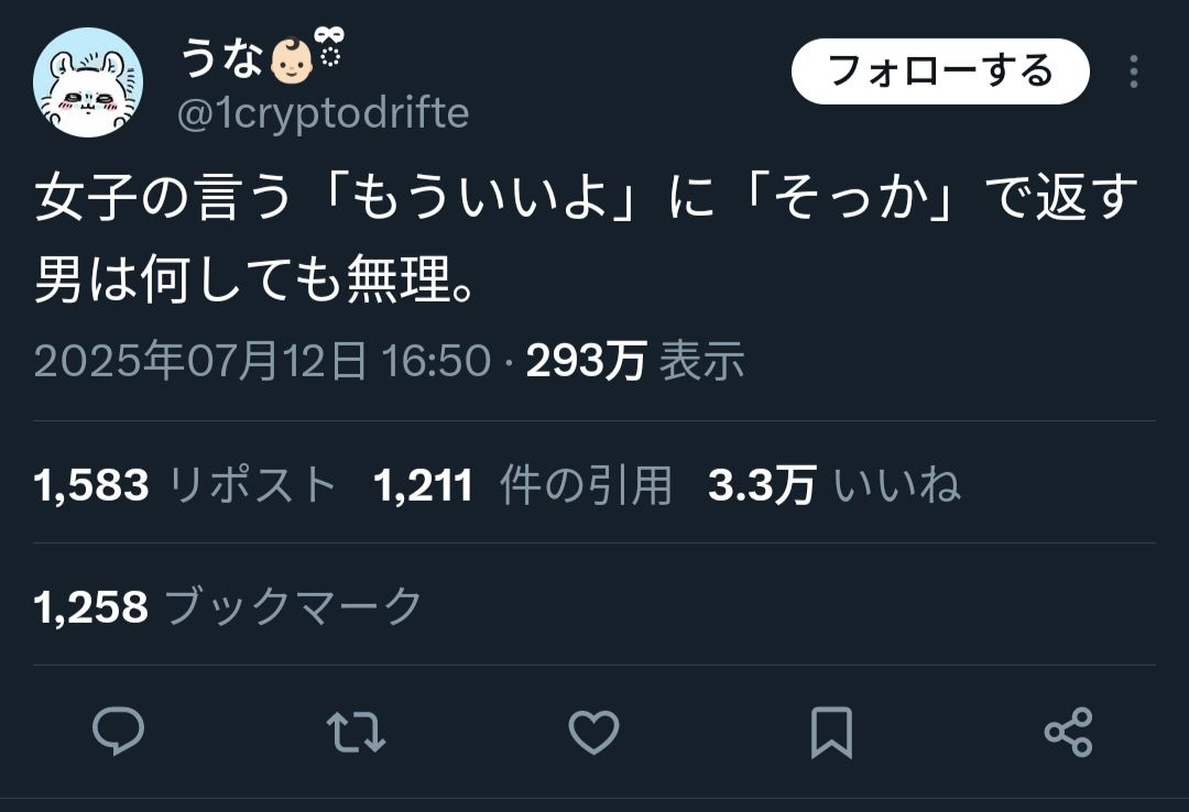 相手の欲しい答えわかってて敢えてそう返してるんだけどな - 37 名前:ここからは表現の自由でイカせていただきます 投稿日時:2025/07/15(火) 23:02:35.39 ID:JowZnPiJ0