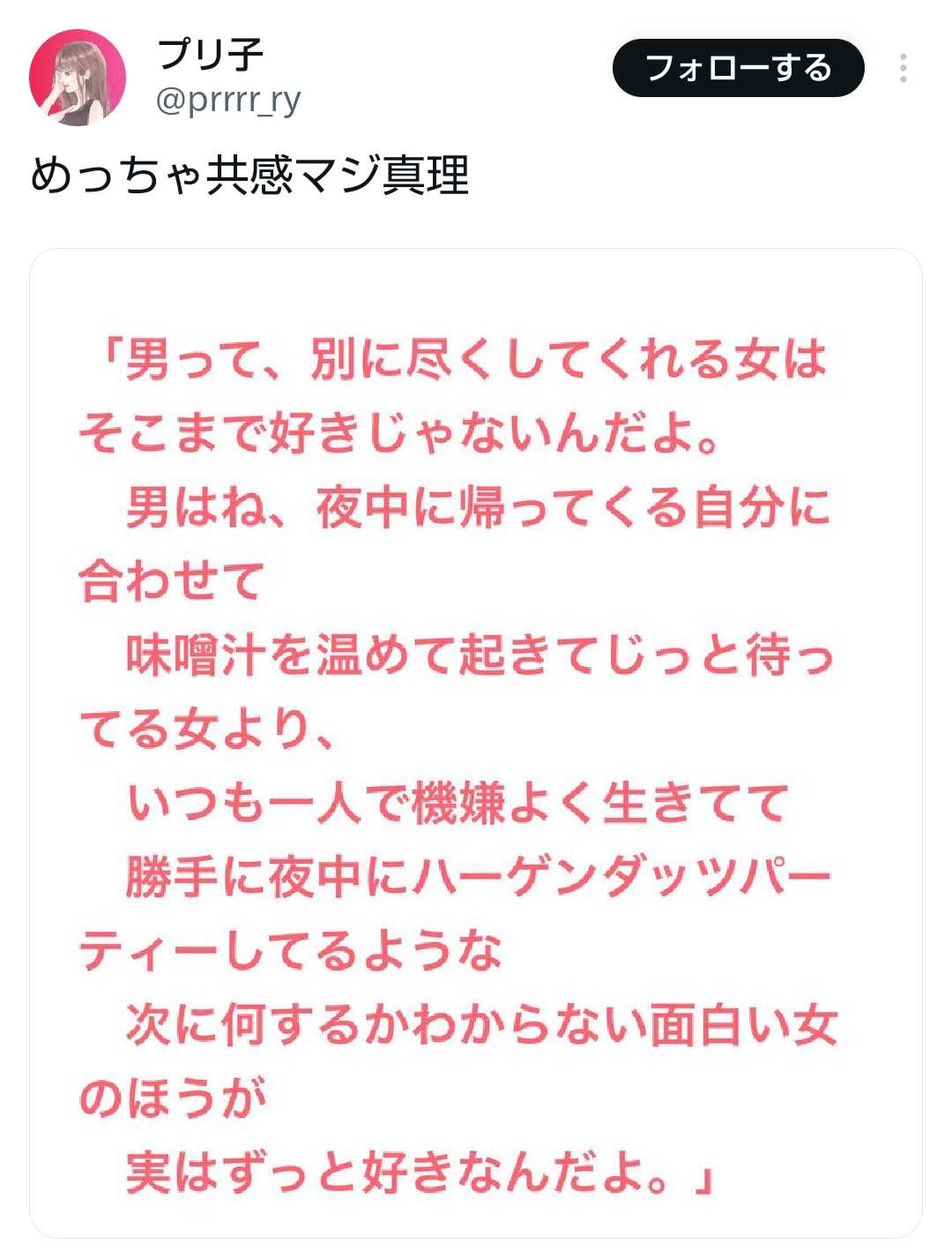 - まぁ変に家事やってイライラ怒ってる女よりは何もせんでも楽しそうに生きてる女の方がいいよね