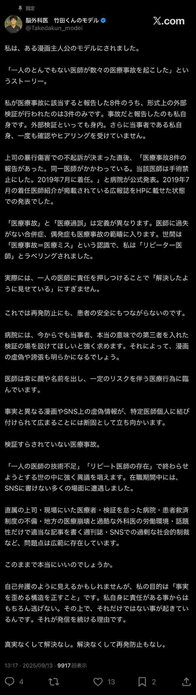 脳外科医 竹田くんのモデル、何度目かの長文お気持ち表明「私は主人公にされた」