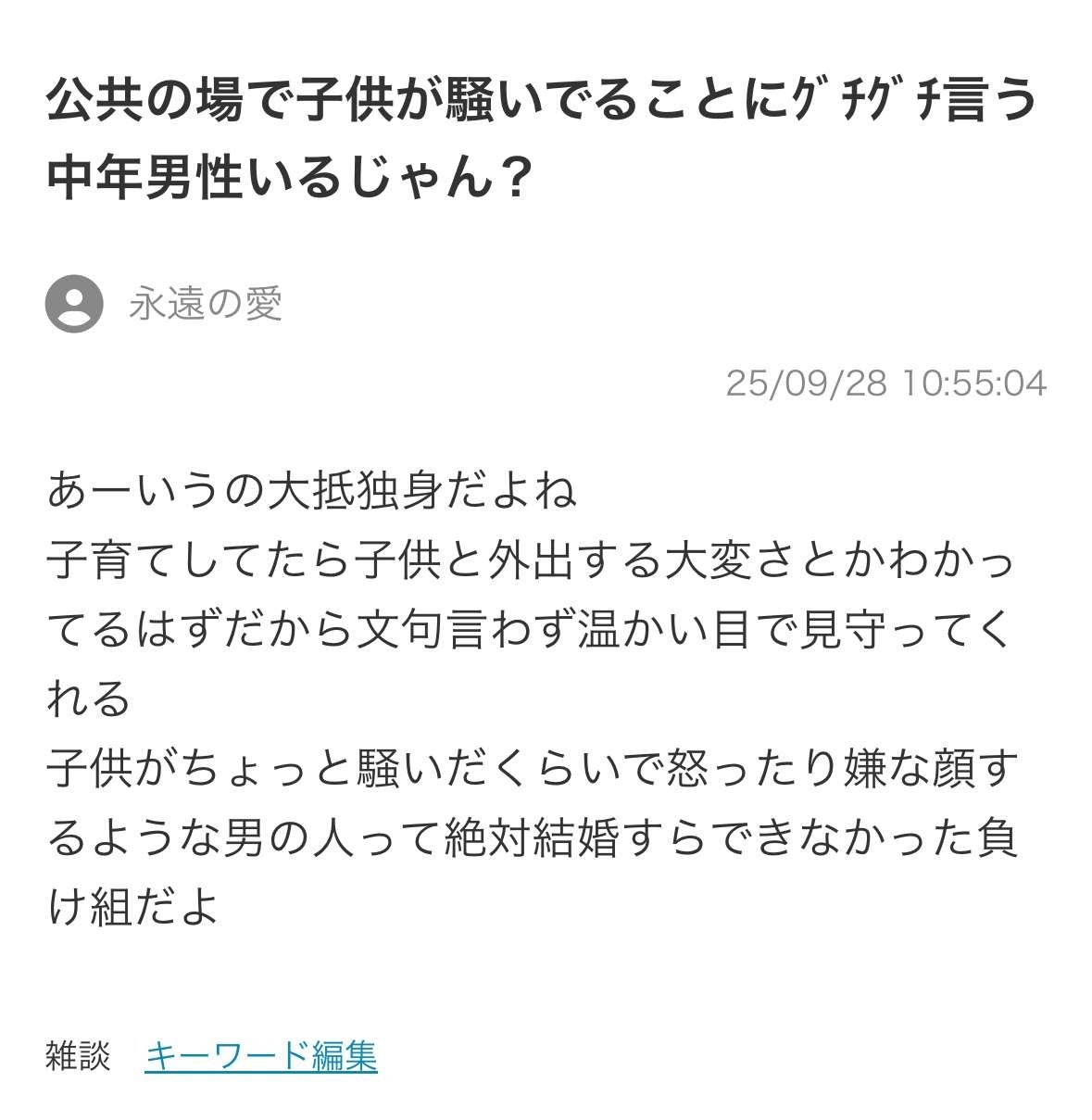 子供がちょっと騒いだくらいで怒ったり嫌な顔するような男の人って絶対結婚すらできなかった負け組だよ - 3 名前:ここからは表現の自由でイカせていただきます 投稿日時:2025/09/30(火) 06:05:31.59 ID:XhB/or8W0