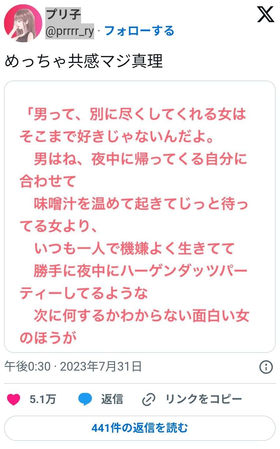 女「男はね、尽くしてくれる女より夜中に一人でハーゲンダッツパーティーしてる女が好きなの」
