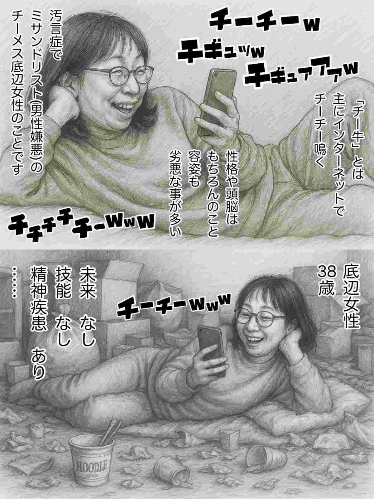 「チー牛」とは、チーチーうるさいチー牛底辺女性(チーメス)の事です。役に立ちましたか?