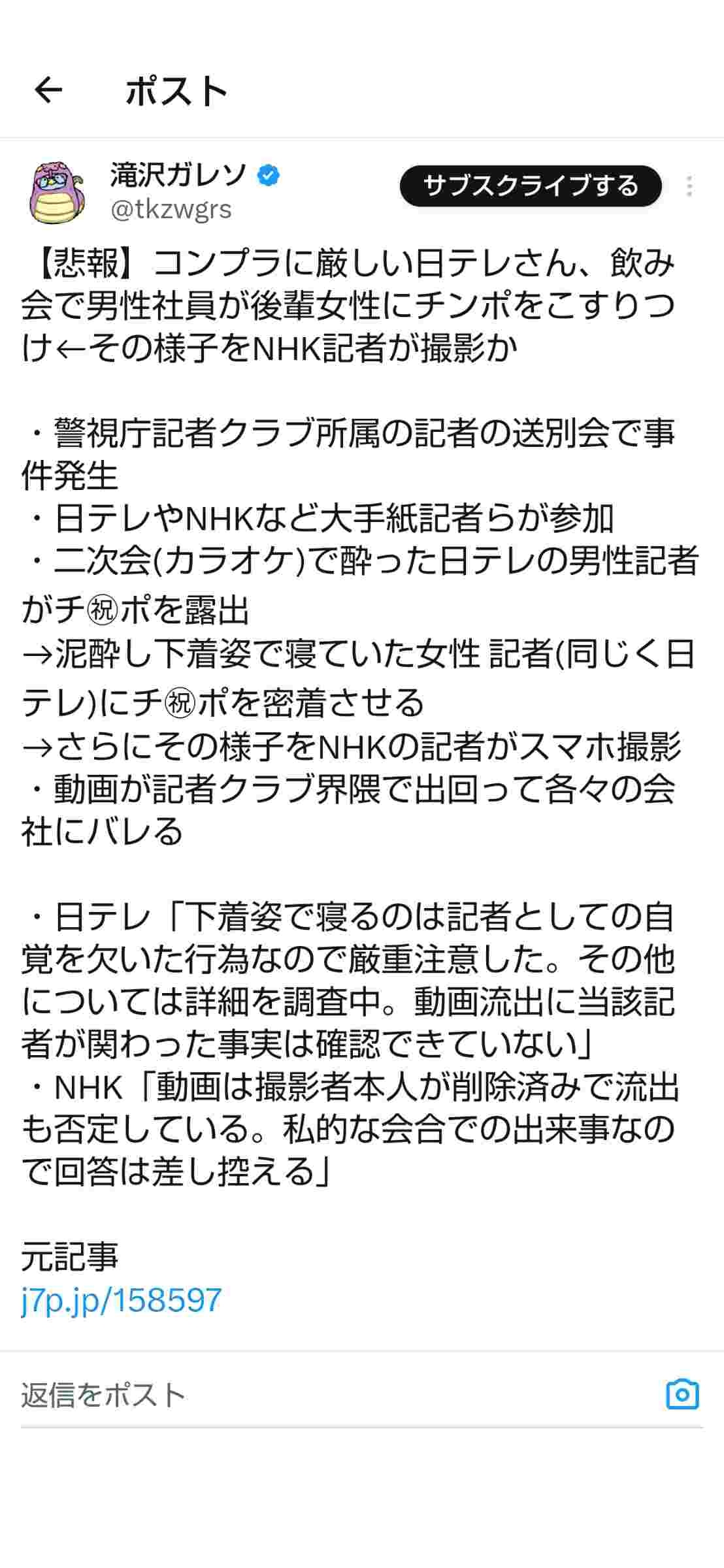 日テレ女性記者チンポ事件、日テレとNHKがやんわりと認める