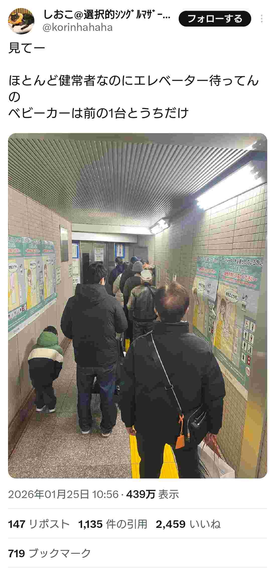 シングルマザー「健常者がエレベーター待ってて渋滞してる!パシャッ」←何様だと批判殺到