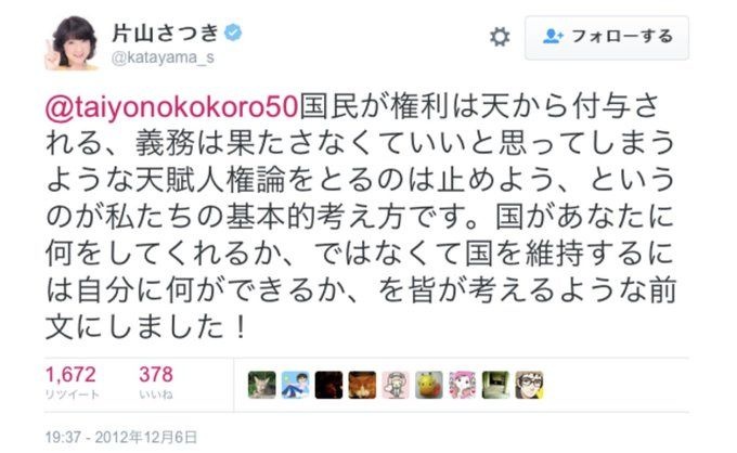- 片山さつき「国民が『権利は天から付与される、義務は果たさなくていい』と思ってしまうような天賦人権論をとるのは止めよう、というのが私たちの基本的な考え方」