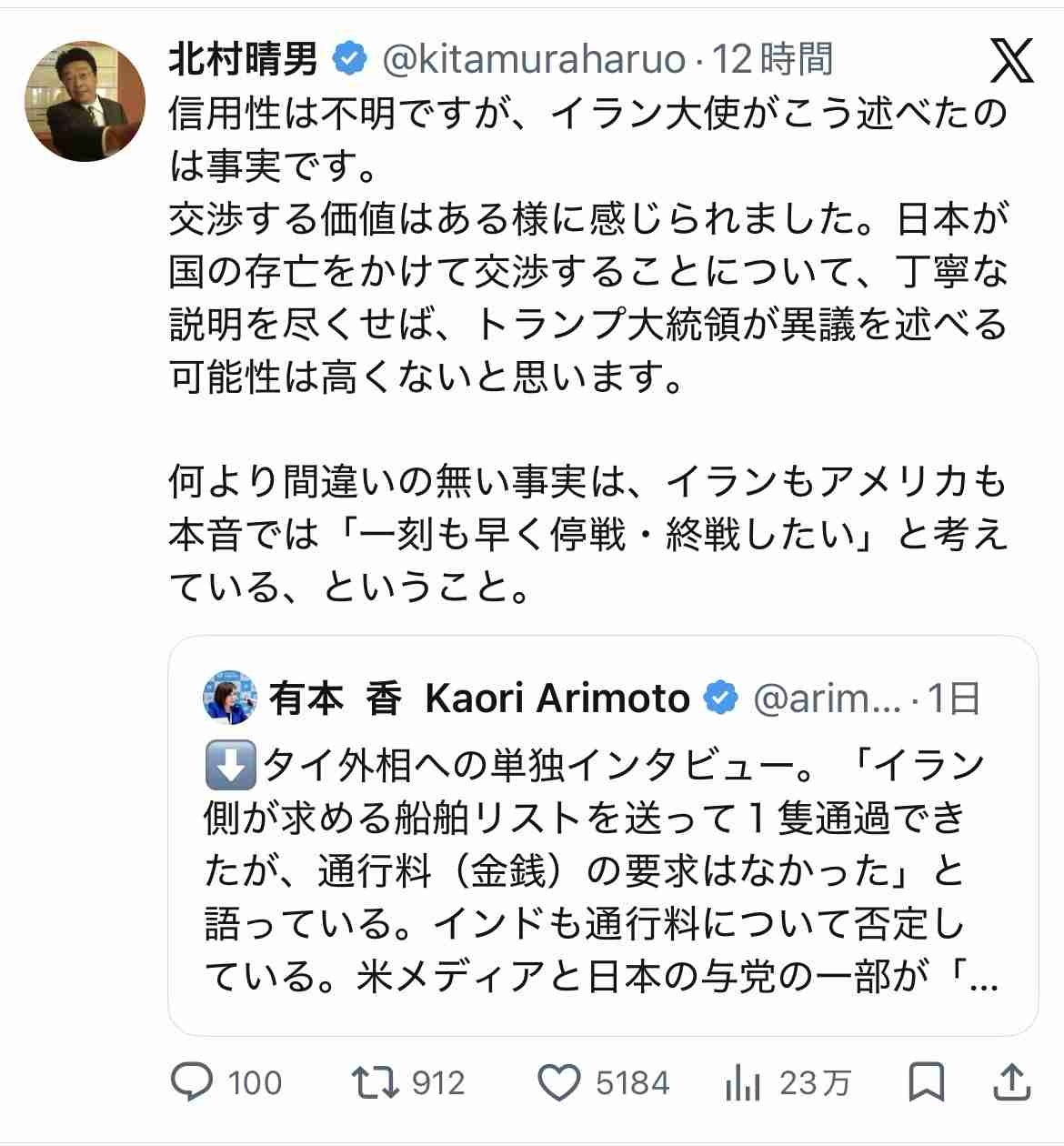 北村晴男「イランもこう言ってるし流石に交渉しようよ…」