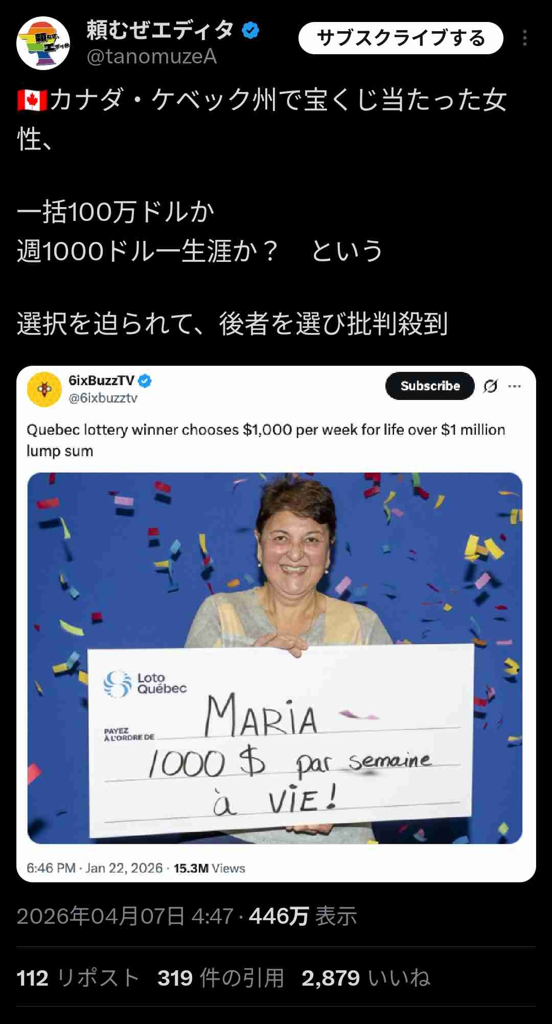 - 【悲報】「宝くじが当たったよ!一括100万ドルか週1000ドル一生涯か選んでね」→週1000ドルを選び批判殺到