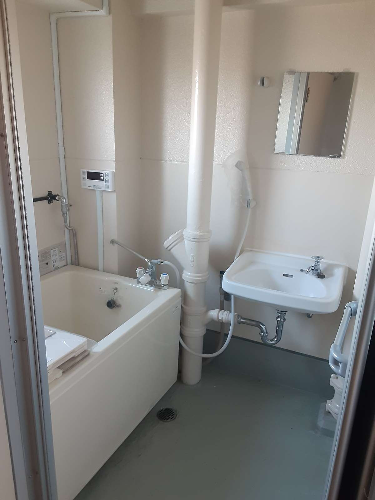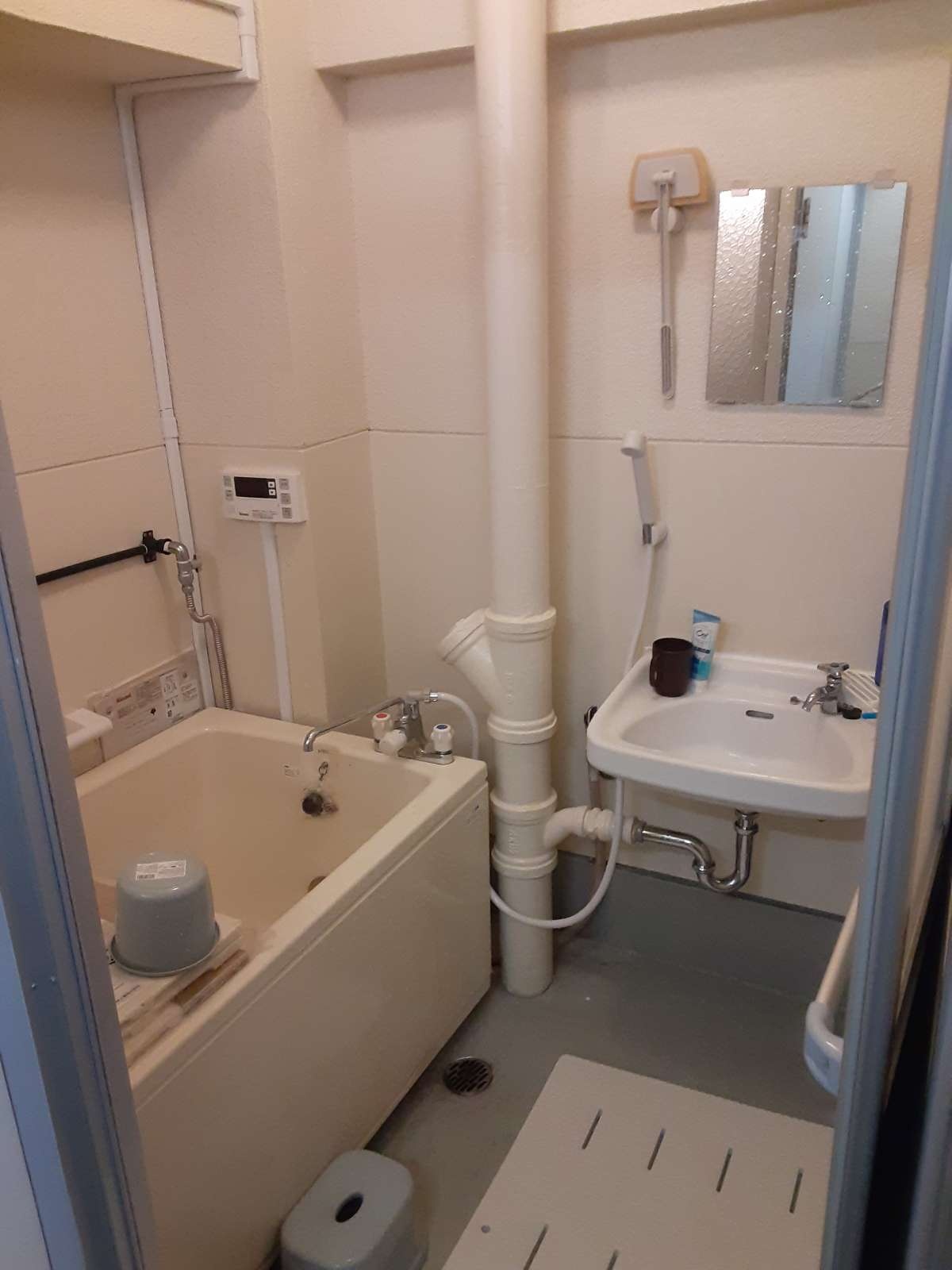 風呂は排管むき出しだけど古いバランス釜じゃなく浴槽ごと自動の新しいやつになってたのは良かったが、まぁ狭かった…