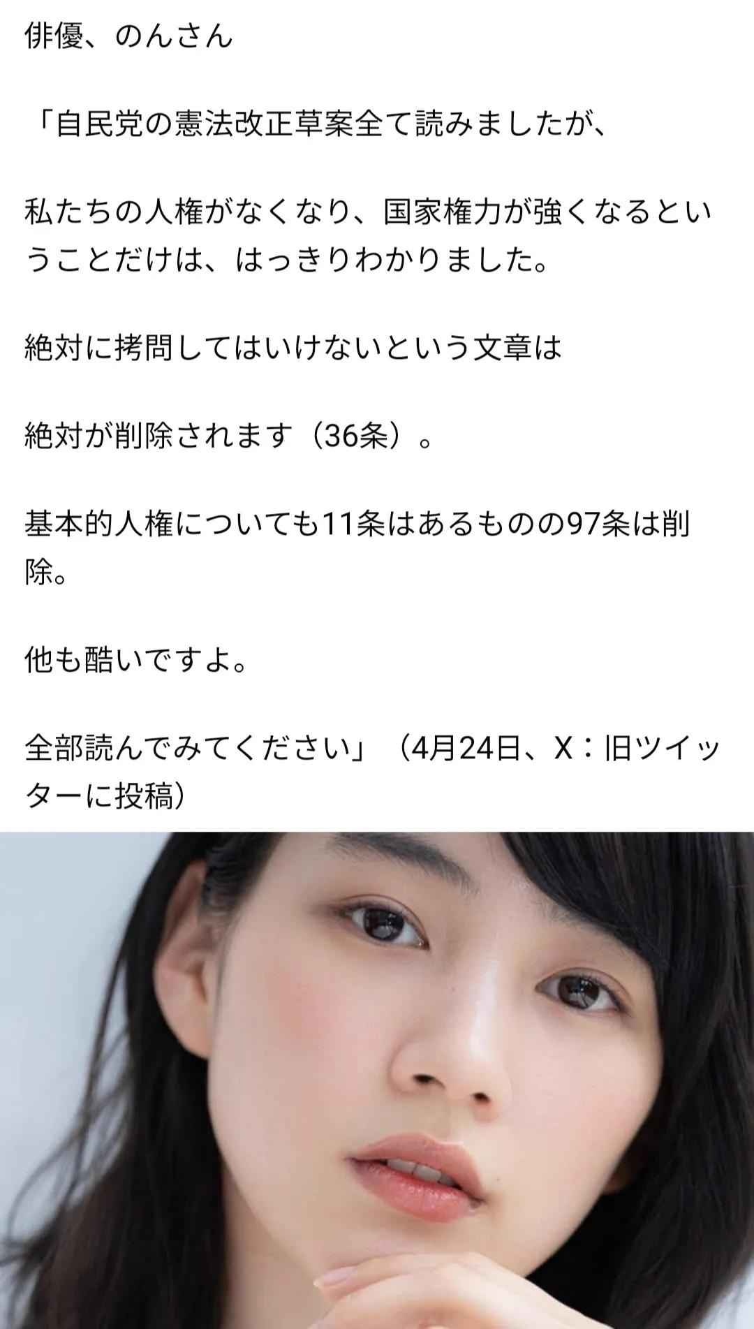 のん(旧姓能年玲奈)さん、自民党の憲法改正草案についてお気持ち表明