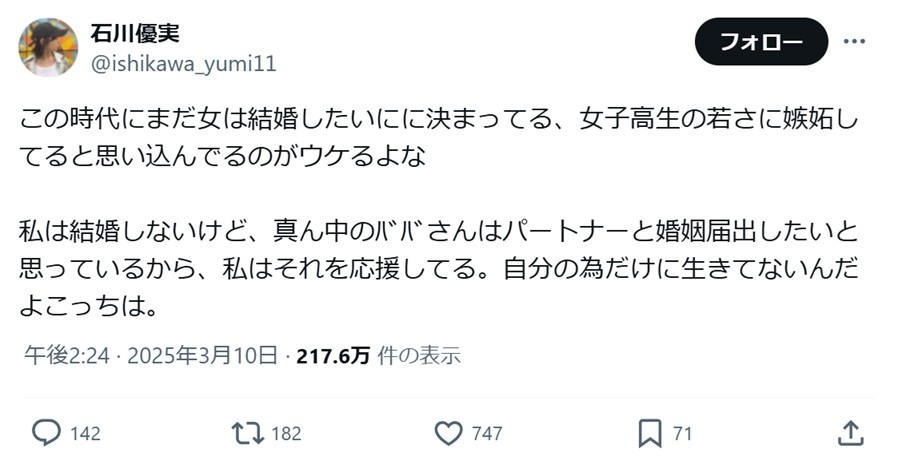 こいつら自分に関係ない別姓のこと考える必要ある? - 162 名前:ここからは表現の自由でイカせていただきます 投稿日時:2025/03/13(木) 08:29:57.686 ID:NINQK3/yV