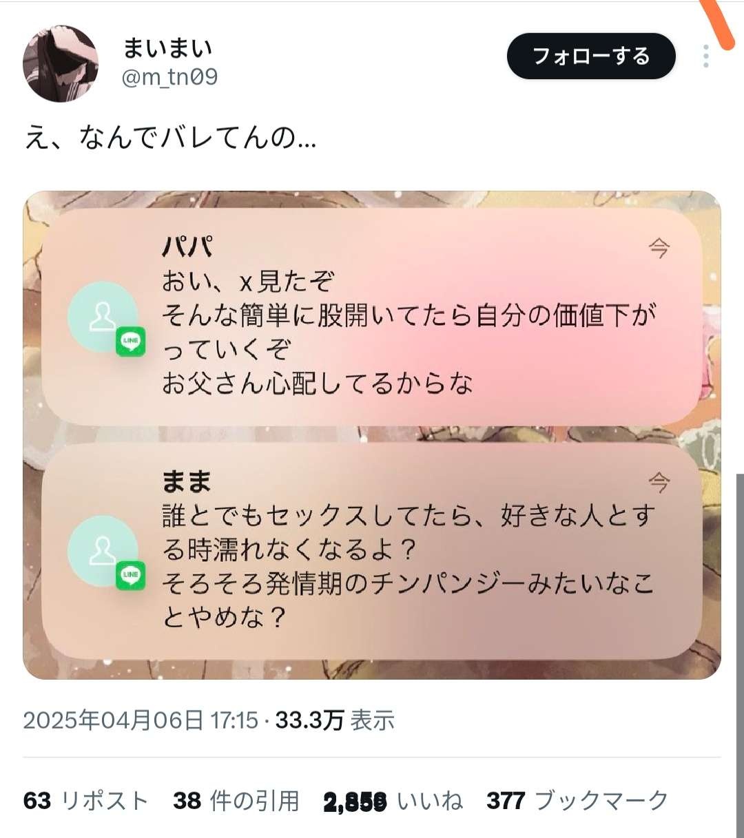 ぱぱの脳が破壊されるやろ - 39 名前:ここからは表現の自由でイカせていただきます 投稿日時:2025/04/13(日) 13:59:46.764 ID:X3wDpd4AX