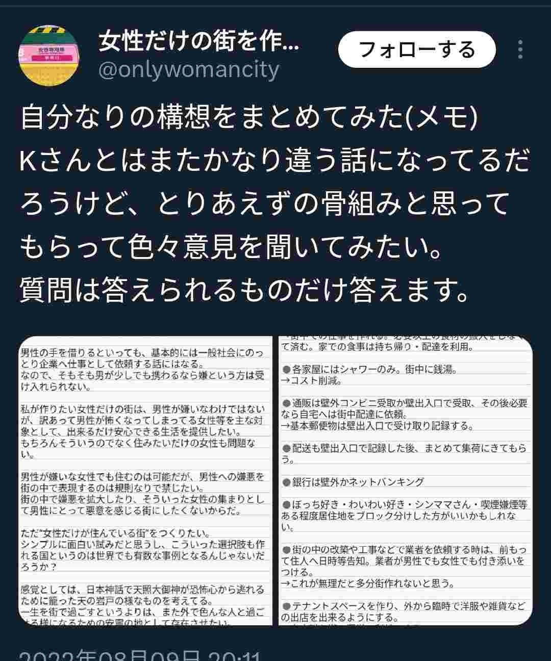 「女性だけの街」プロジェクト、ここまで具体的に話が進んでしまう…震えろ弱男ども…