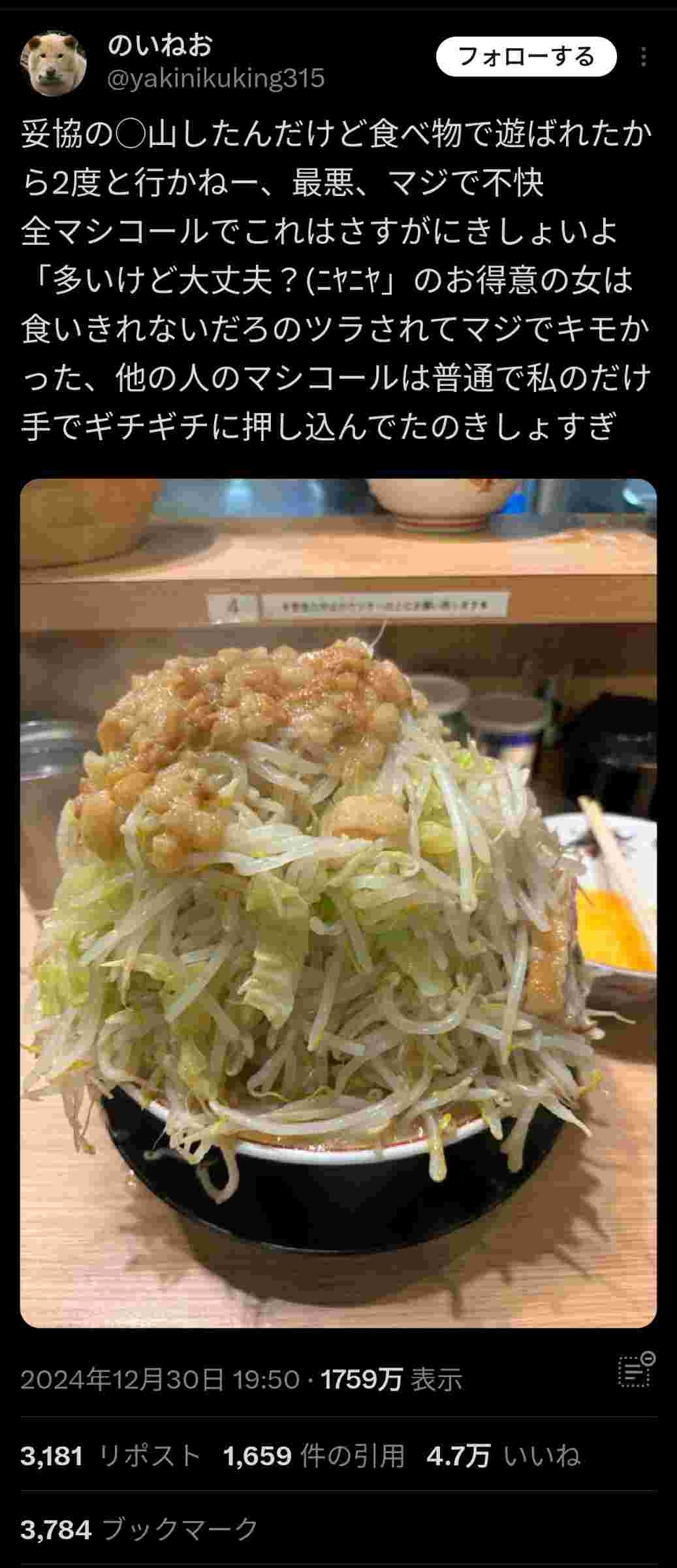 - 〇山は倍野菜でこんなに入れてくれる!神店舗とか言っとけば女だけ特別扱いするって別方向で炎上させられたのに