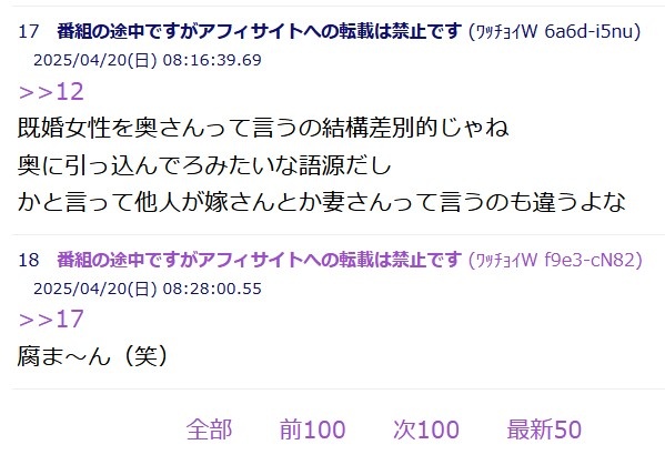 50 名前:ここからは表現の自由でイカせていただきます 投稿日時:2025/04/20(日) 09:27:22.008 ID:0QbYQBC1p