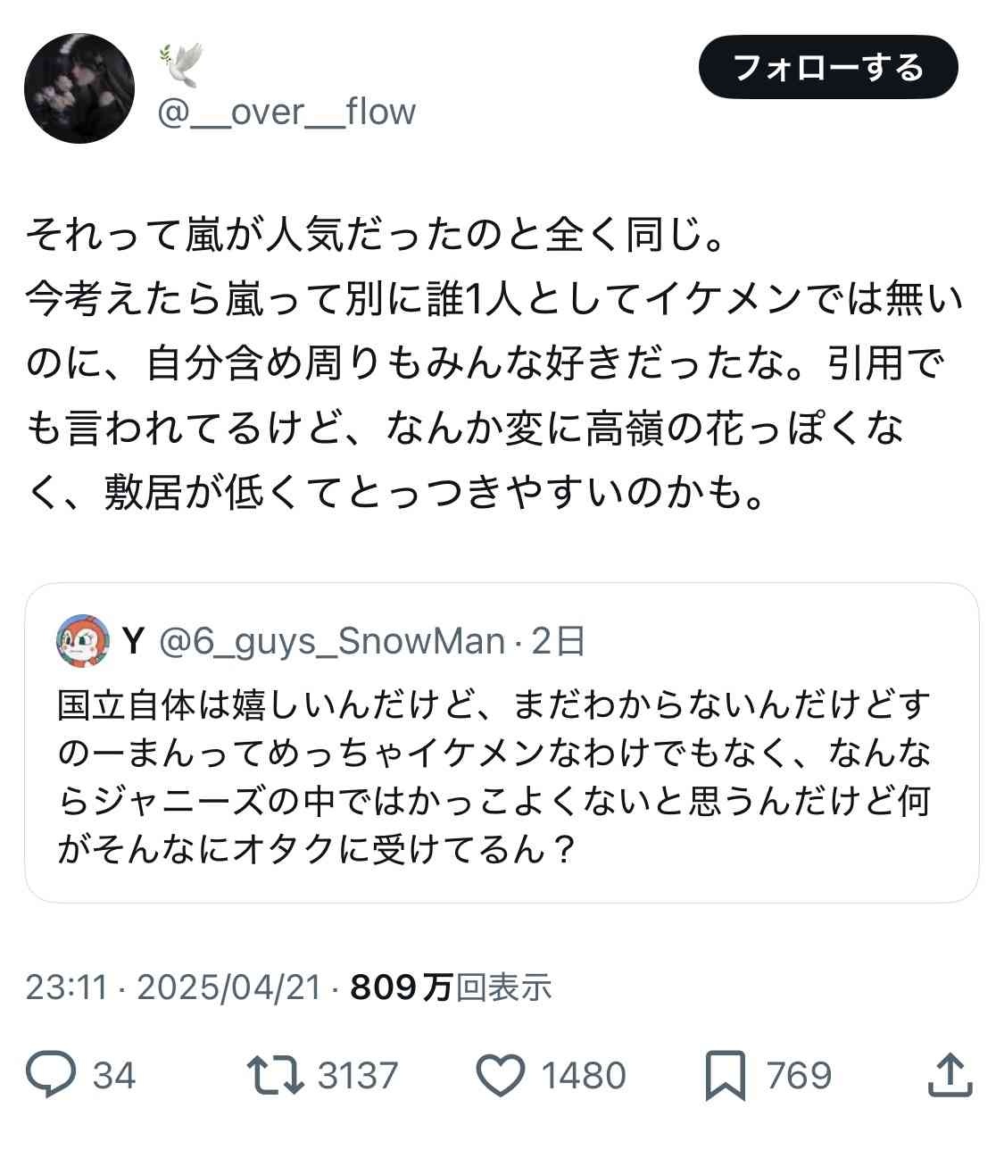 なんか一般人気はあるけど嵐ファンとかジャニオタからは不人気らしい - 4 名前:ここからは表現の自由でイカせていただきます 投稿日時:2025/04/23(水) 09:38:13.109 ID:.NIEfZeft
