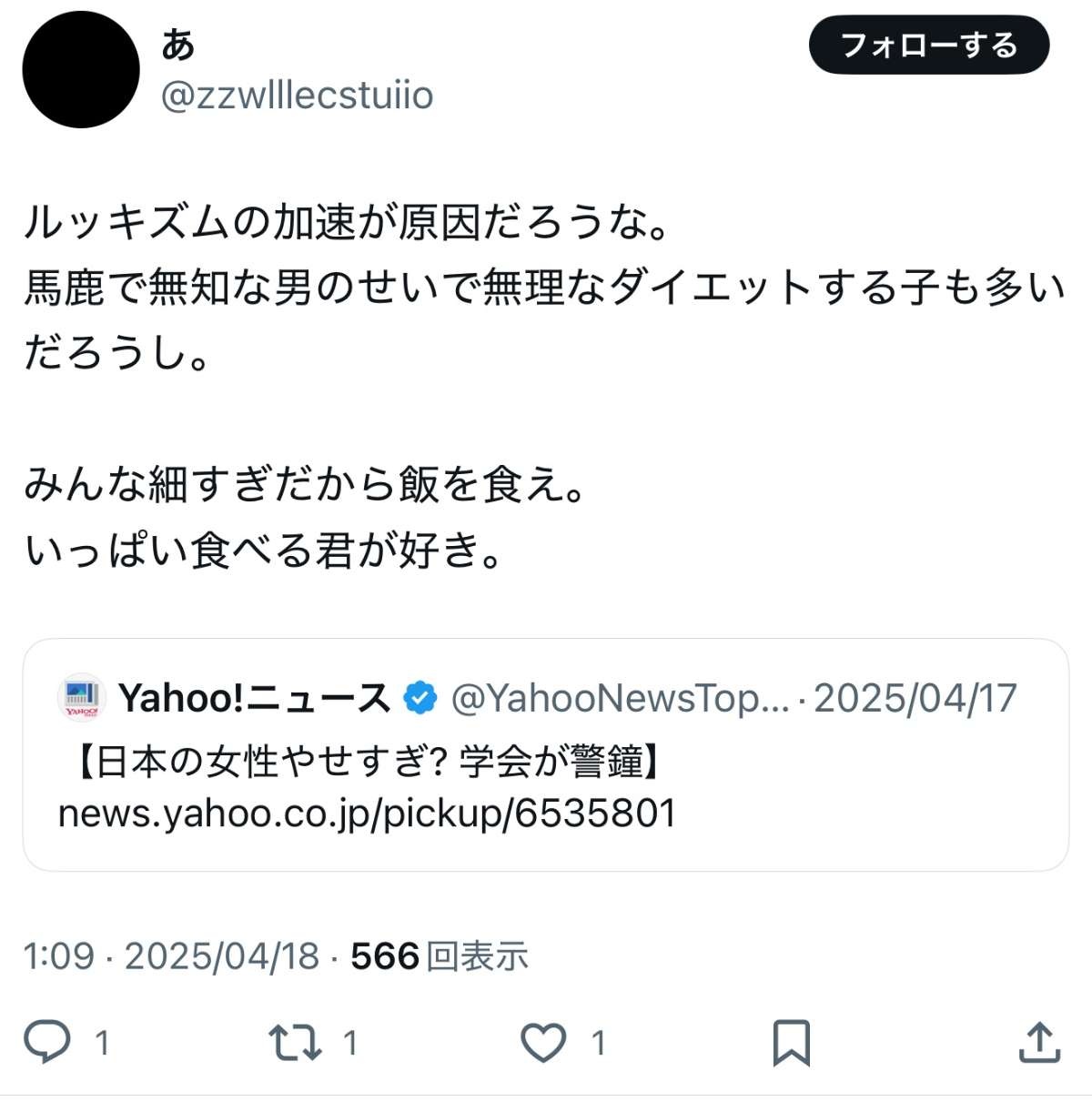 同性マウントのためにやせてるくせに - 18 名前:ここからは表現の自由でイカせていただきます 投稿日時:2025/04/25(金) 17:11:48.289 ID:yb8XQ89uR