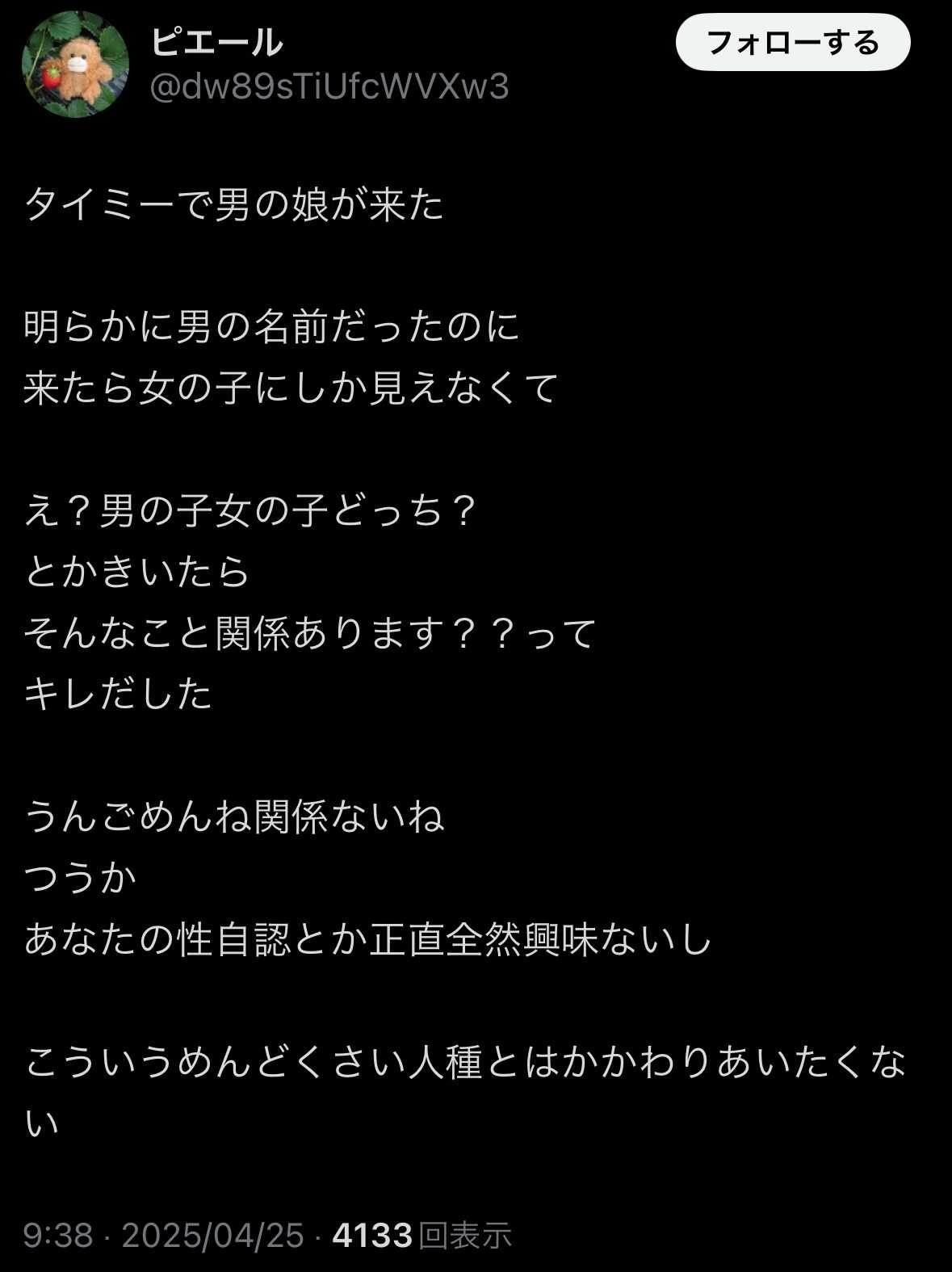- 自分から性別聞いといて性自認云々言い出すの脳に障害ありそう