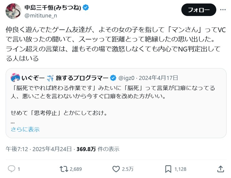 10 名前:ここからは表現の自由でイカせていただきます 投稿日時:2025/04/27(日) 13:12:04.323 ID:MZfXwyMCM