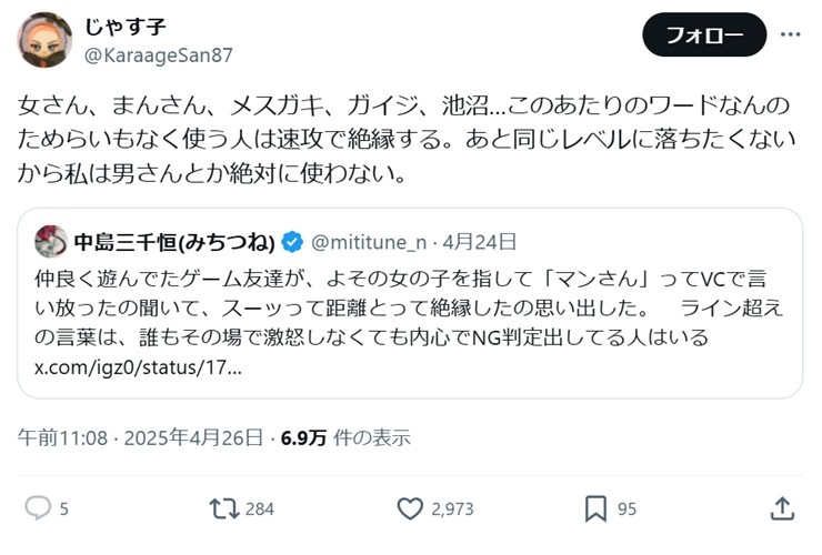 5 名前:ここからは表現の自由でイカせていただきます 投稿日時:2025/04/27(日) 13:10:58.715 ID:MZfXwyMCM