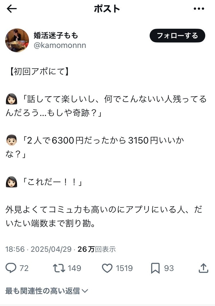 - 社会人の初回デートで割り勘とかろくな男じゃないやろ