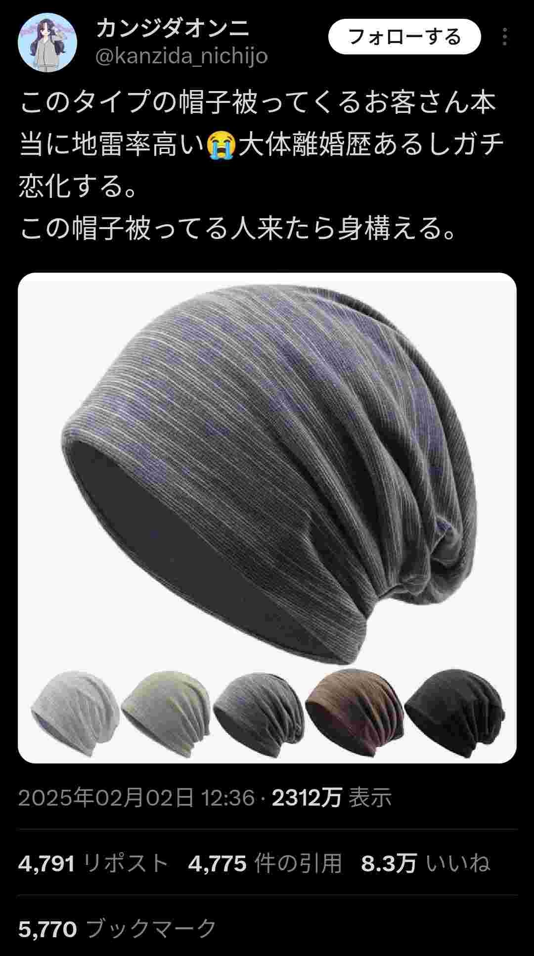 女さん「この帽子被ってる男はヤバい」8.3万いいね