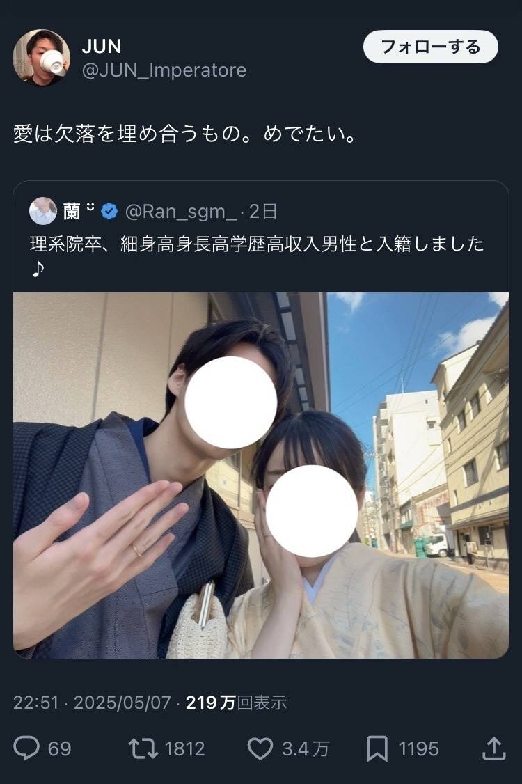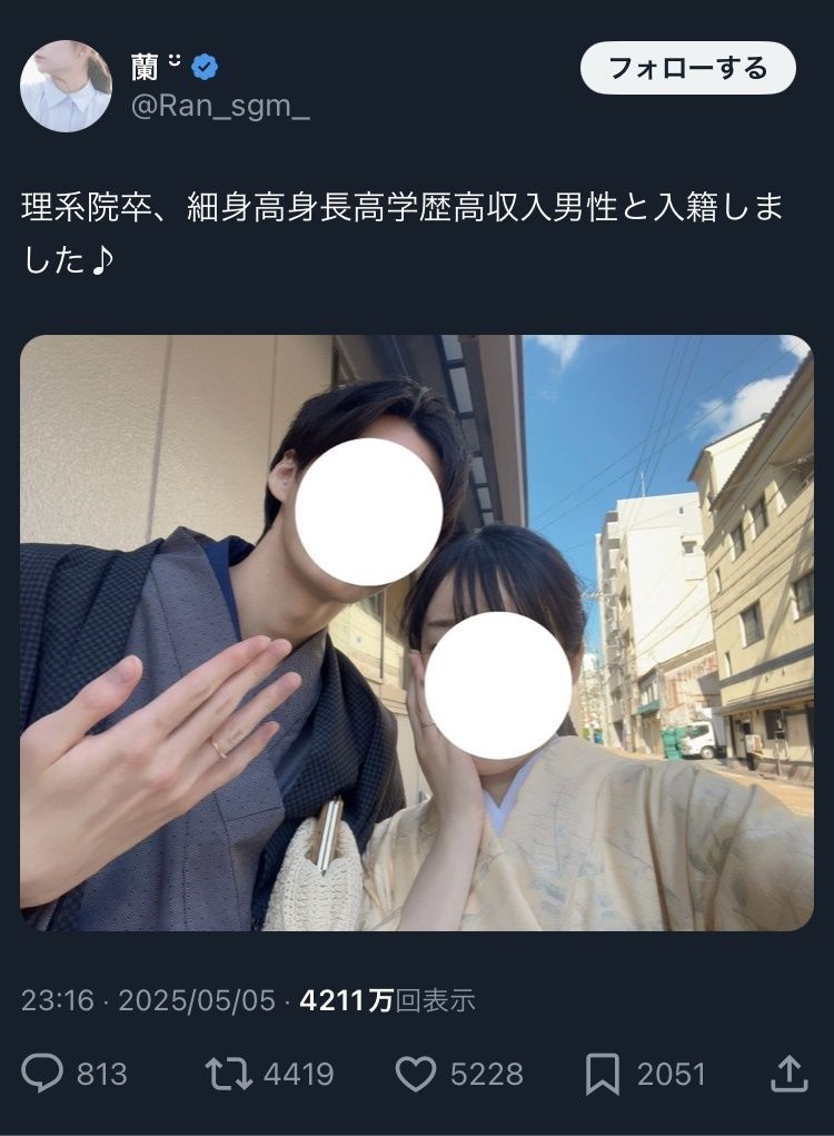 👩「理系院卒、細身高身長高学歴高収入男性と入籍しました♪」👨「💢」