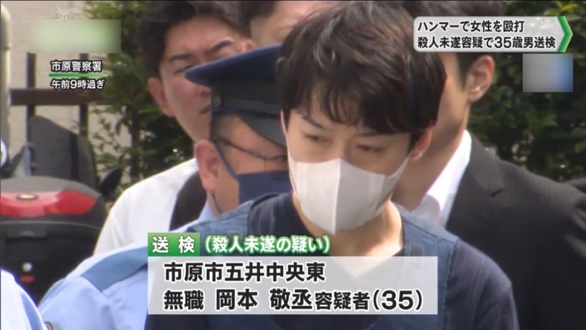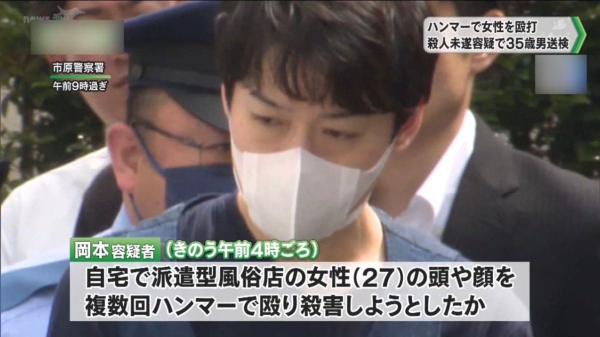 - 無職の岡本敬丞容疑者(35)は7日午前4時ごろ、市原市の自宅で派遣型風俗で訪れた27歳の女性の頭をハンマーで複数回殴ったとして、殺人未遂の疑いで逮捕されました。女性は頭から血を流して倒れていて重傷です。