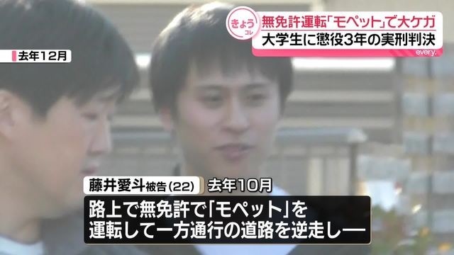 - ペダル付き原付バイク「モペット」を無免許で運転し、自転車に乗った男性に衝突し大ケガをさせた罪などに問われた大学生の藤井愛斗被告(22)に対し、東京地裁は21日、懲役3年の実刑判決を言い渡しました。