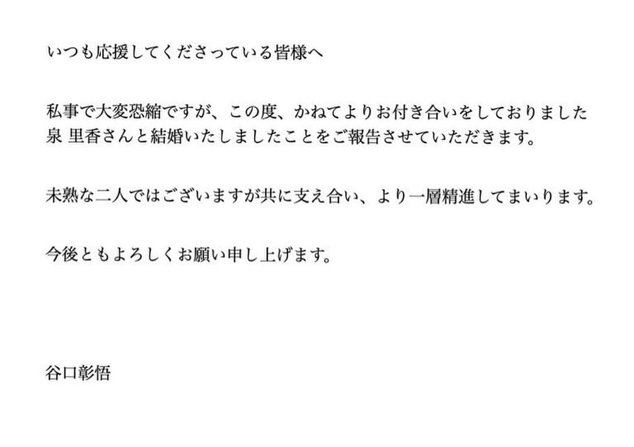 - サッカー日本代表 谷口彰梧がモデル泉里香との結婚を発表(デイリースポーツ)