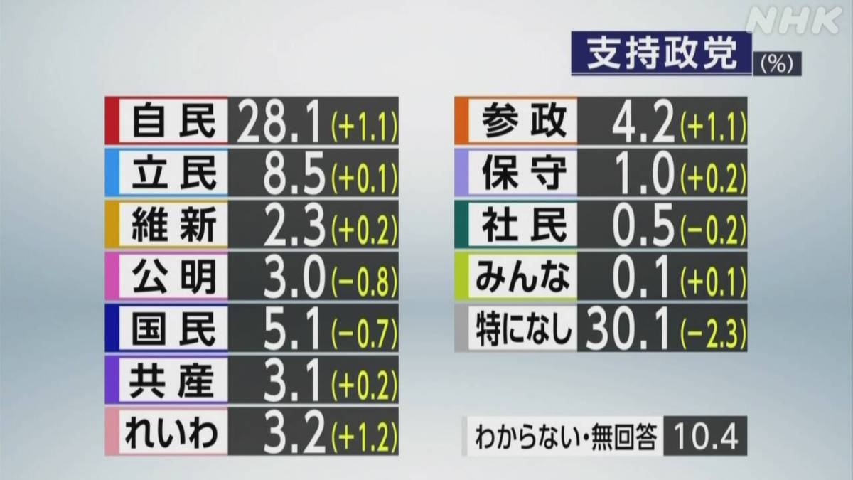 最新 政党支持率 自民28.1% 立憲8.5% 国民5.1% 参政4.2% れいわ3.2% 共産3.1% 公明3.0%😢