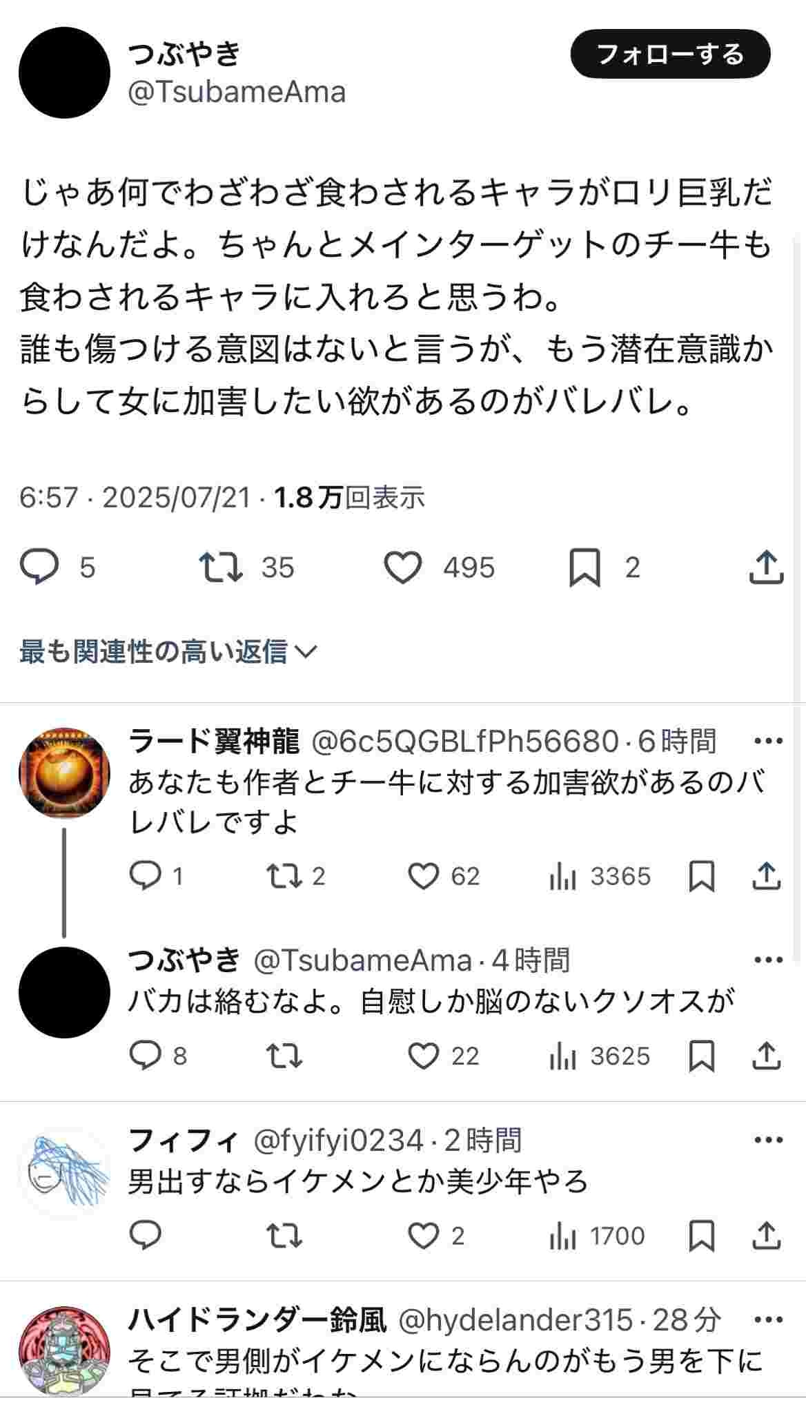- 36 名前:ここからは表現の自由でイカせていただきます 投稿日時:2025/07/21(月) 13:48:49.109 ID:IAQEcx/.x