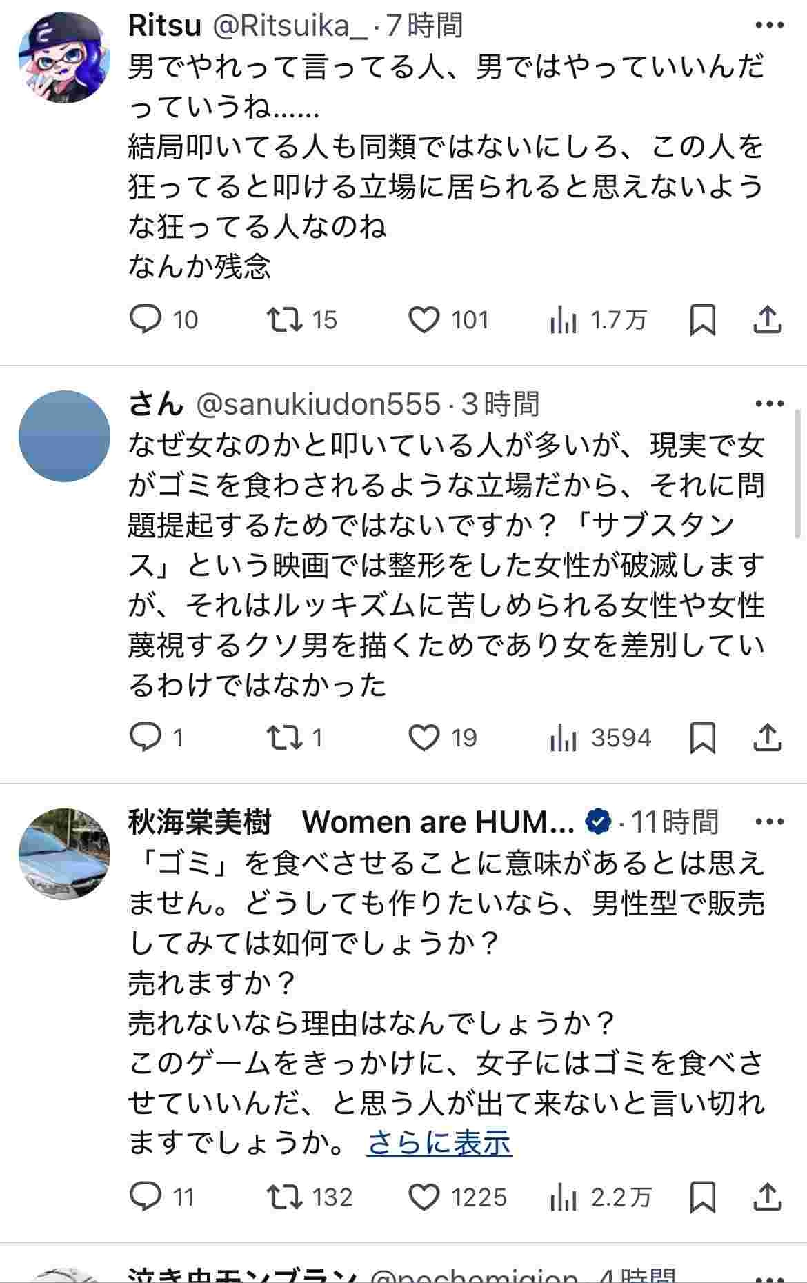 なんで女でやるんですか!?男は女に対してゴミを食べさせたいという加害欲があるからですよねえ!?