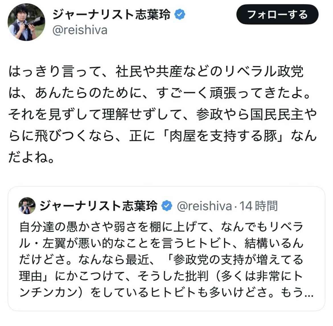 リベラルさん、発狂…「社民や共産を支持しない国民は豚💢💢」