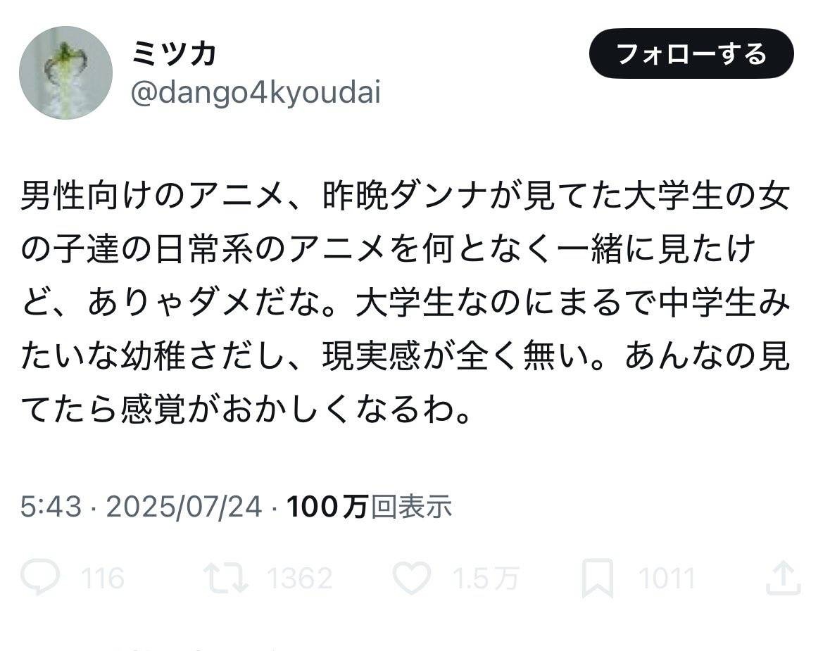 女性「日常系アニメ見たけど大学生キャラが中学生みたいな幼稚さで気持ち悪い。これなんで?」 ←100万View