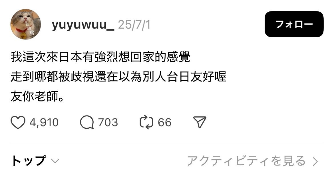 どこに行っても差別されるし、台湾と日本は仲がいいと思ってたのに - 2 名前:ここからは表現の自由でイカせていただきます 投稿日時:2025/07/30(水) 22:41:14.638 ID:pxWvSXP9X